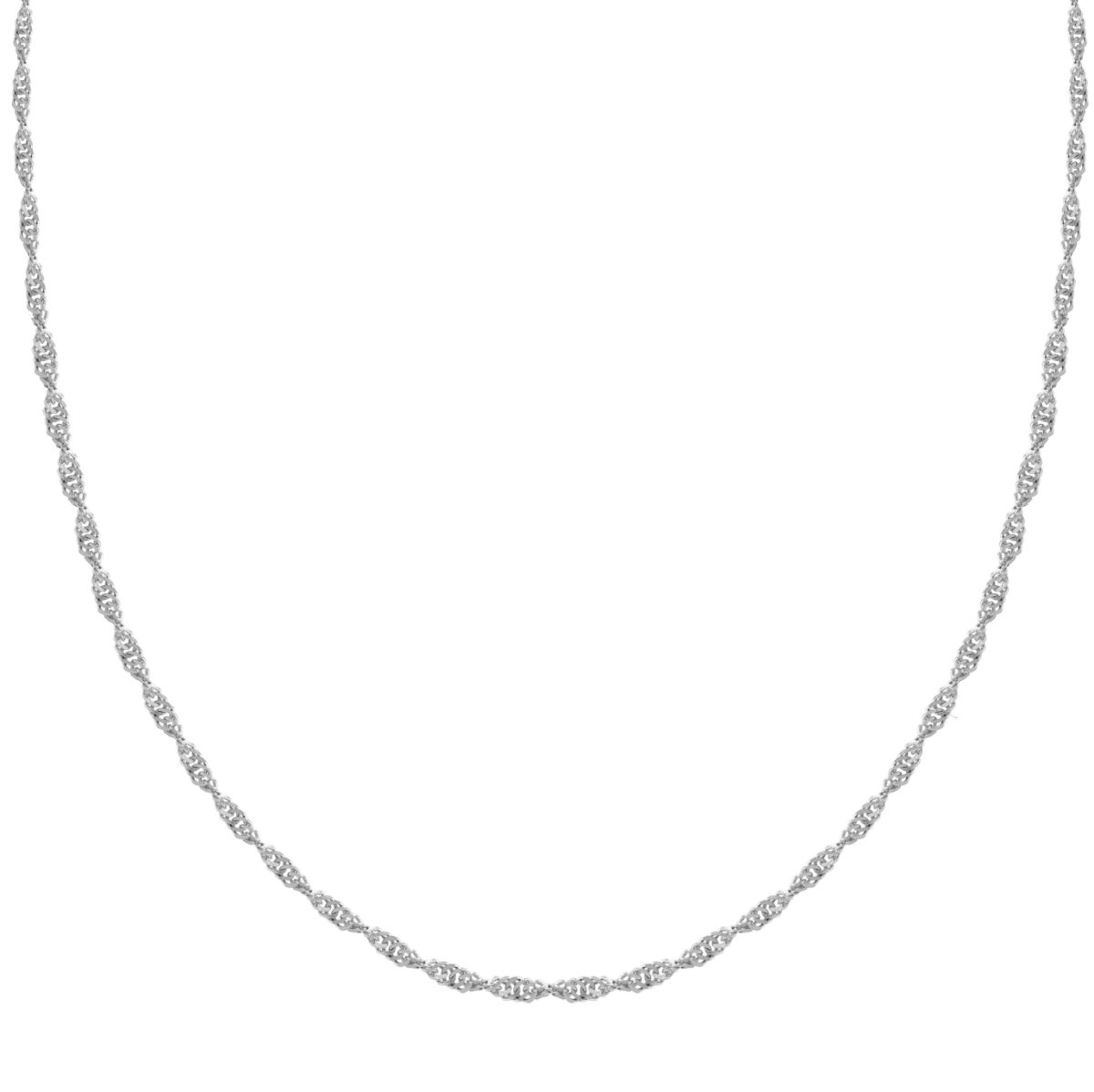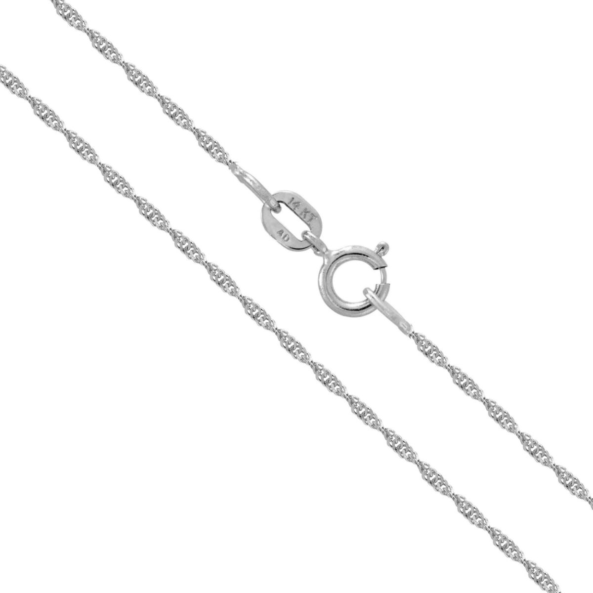 This simple 14K white gold 1.0mm singapore chain features a spring clasp. It is available in several lengths, 16″, 18″, 20″, 22″ and 24″ long. This piece is a beautiful example of the intricate singapore chain.