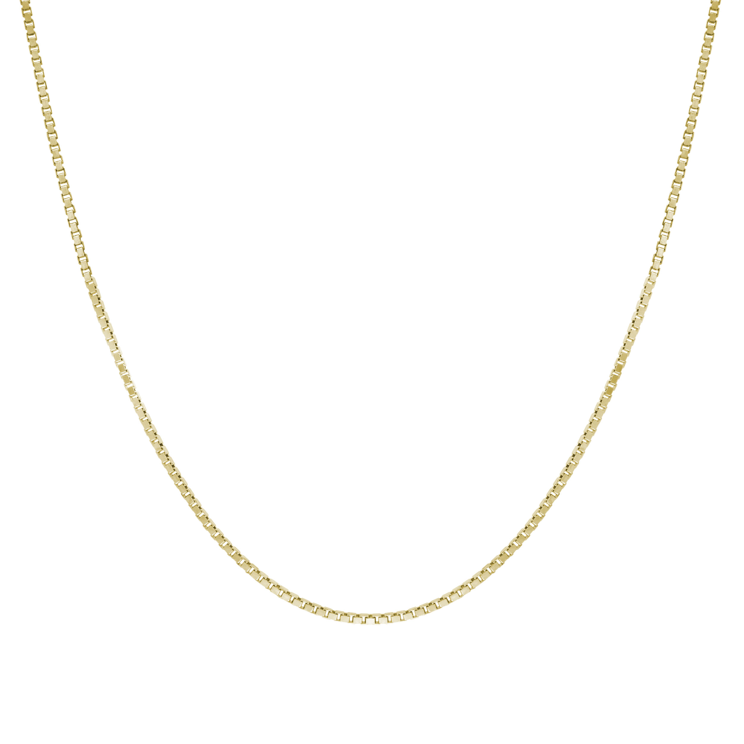 This simple 14K yellow gold 0.5mm box chain is one of our most popular chains and features a spring clasp. It is available in several lengths, including 16 inches, 18 inches, and 20 inches long. This chain is lightweight and smooth, making it less likely to get caught in your hair or on loose clothing. The ideal everyday chain.