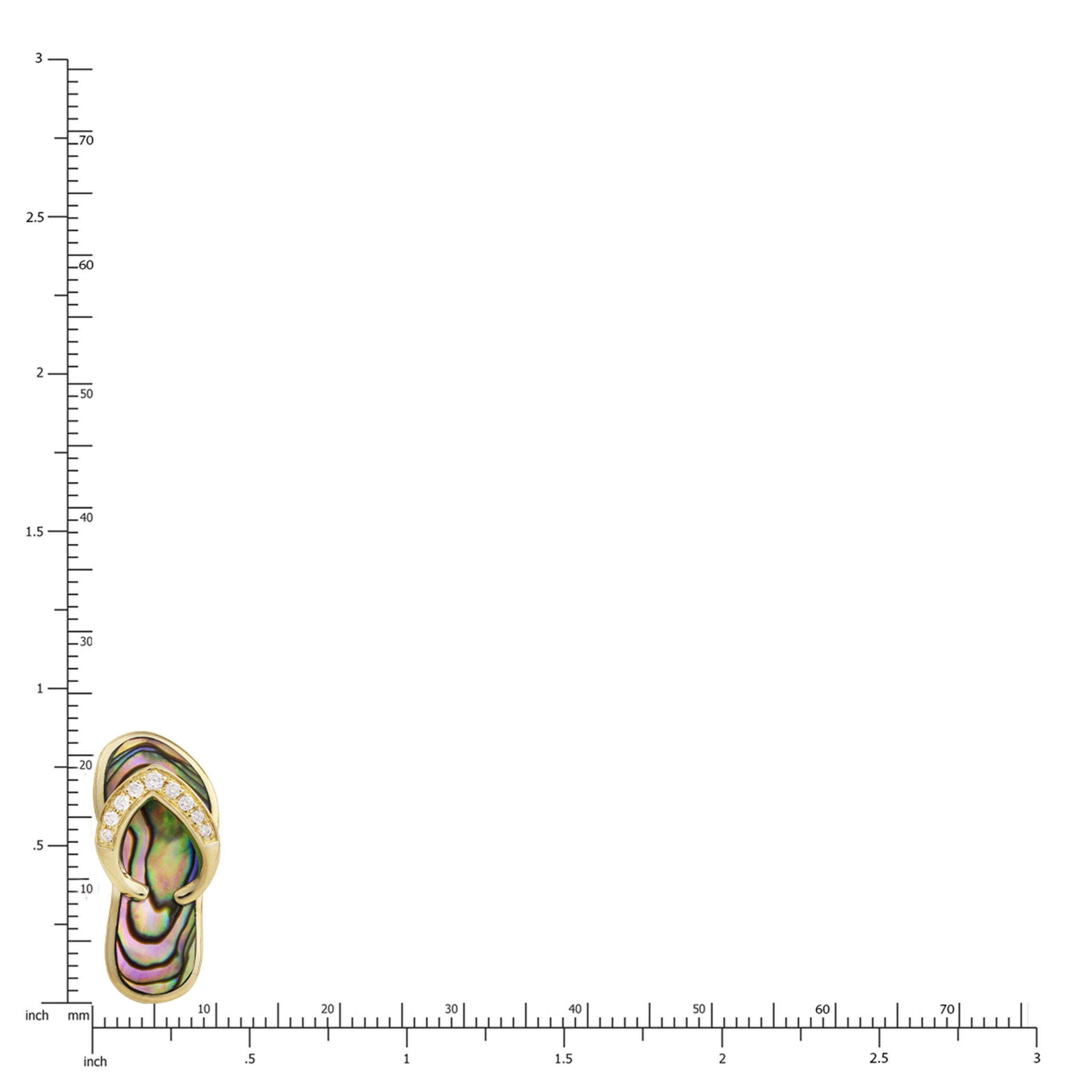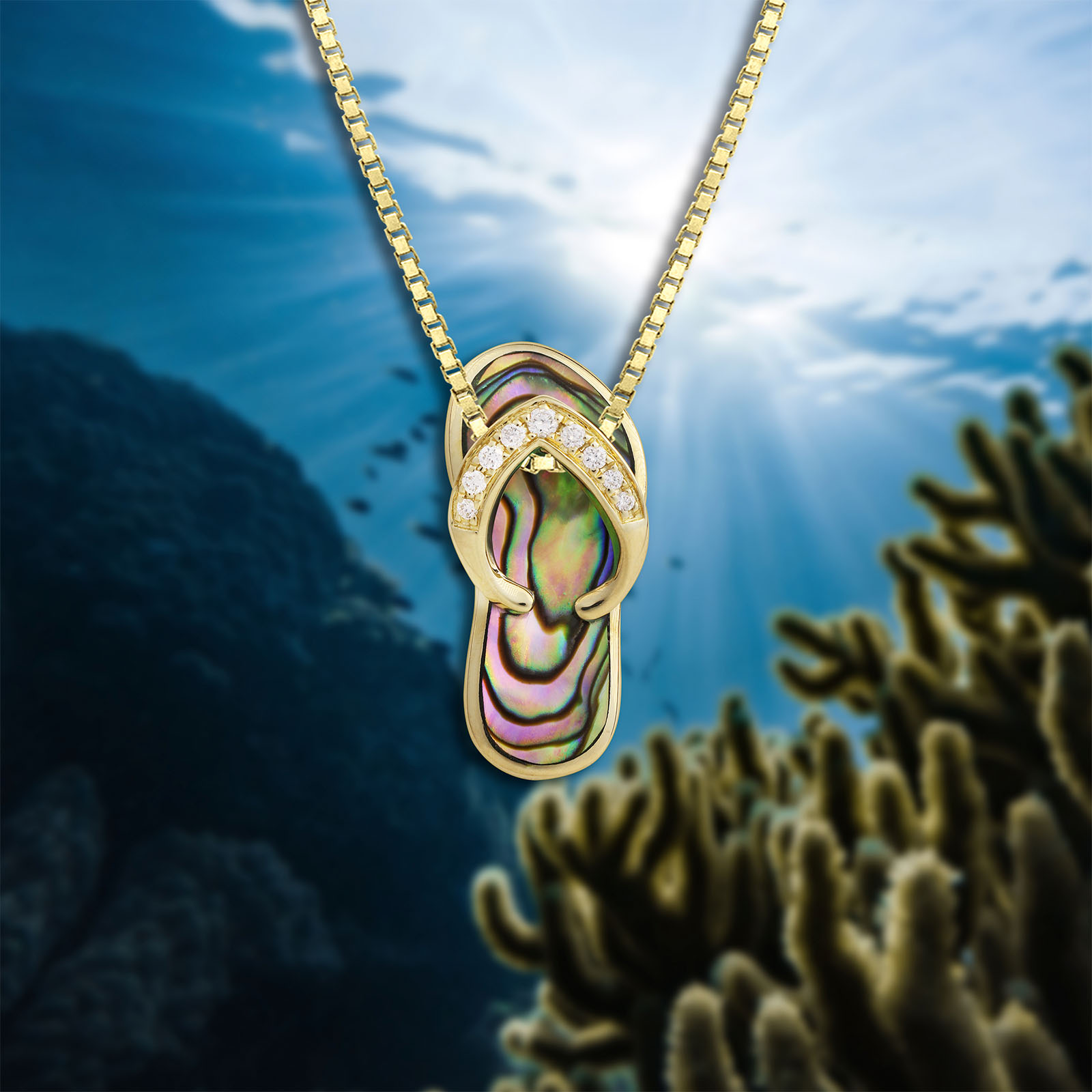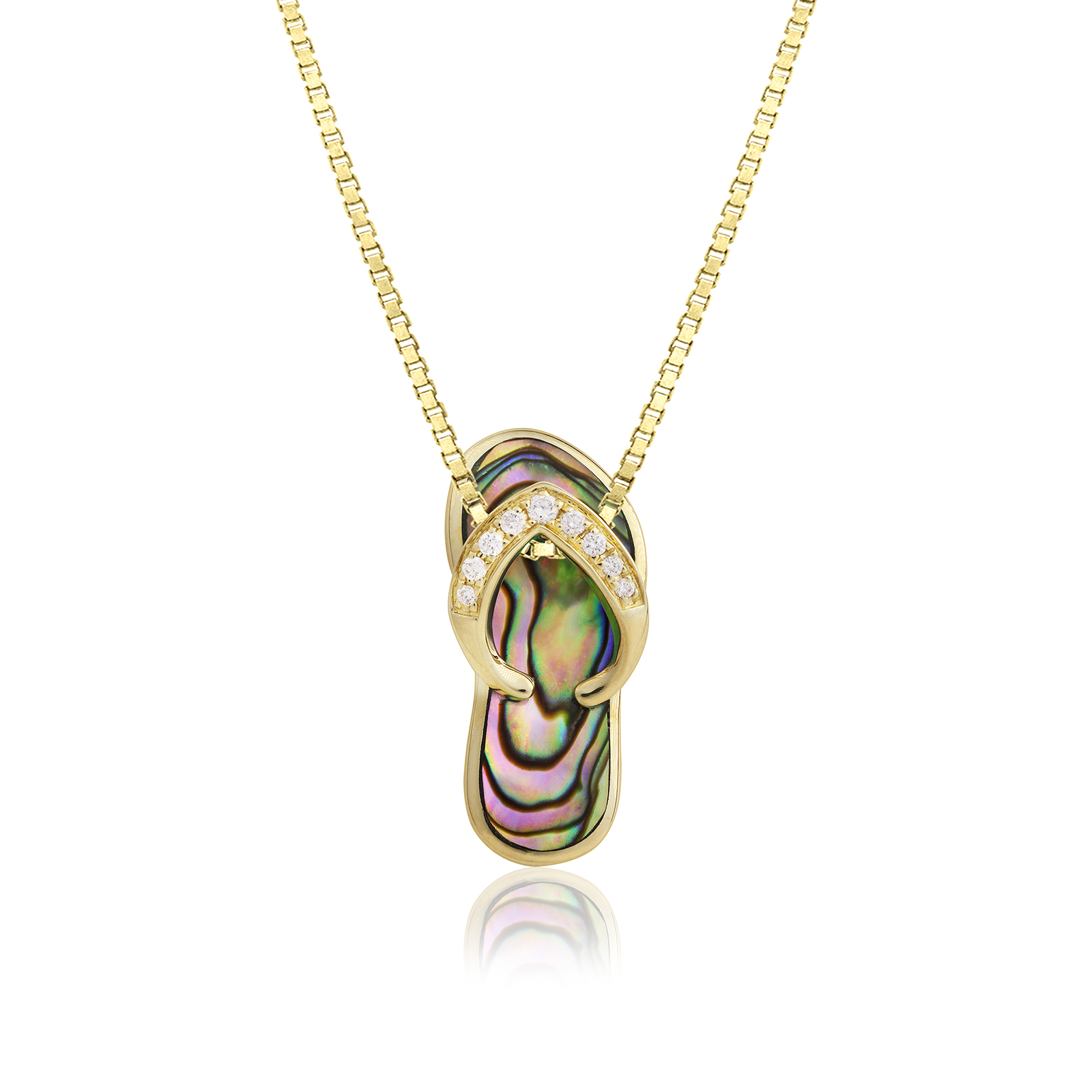 Bring home the beautiful, 14K YG abalone slipper pendant. 22mm tall and 10mm wide. Lifetime guarantee. From Honolulu, Hawaii.