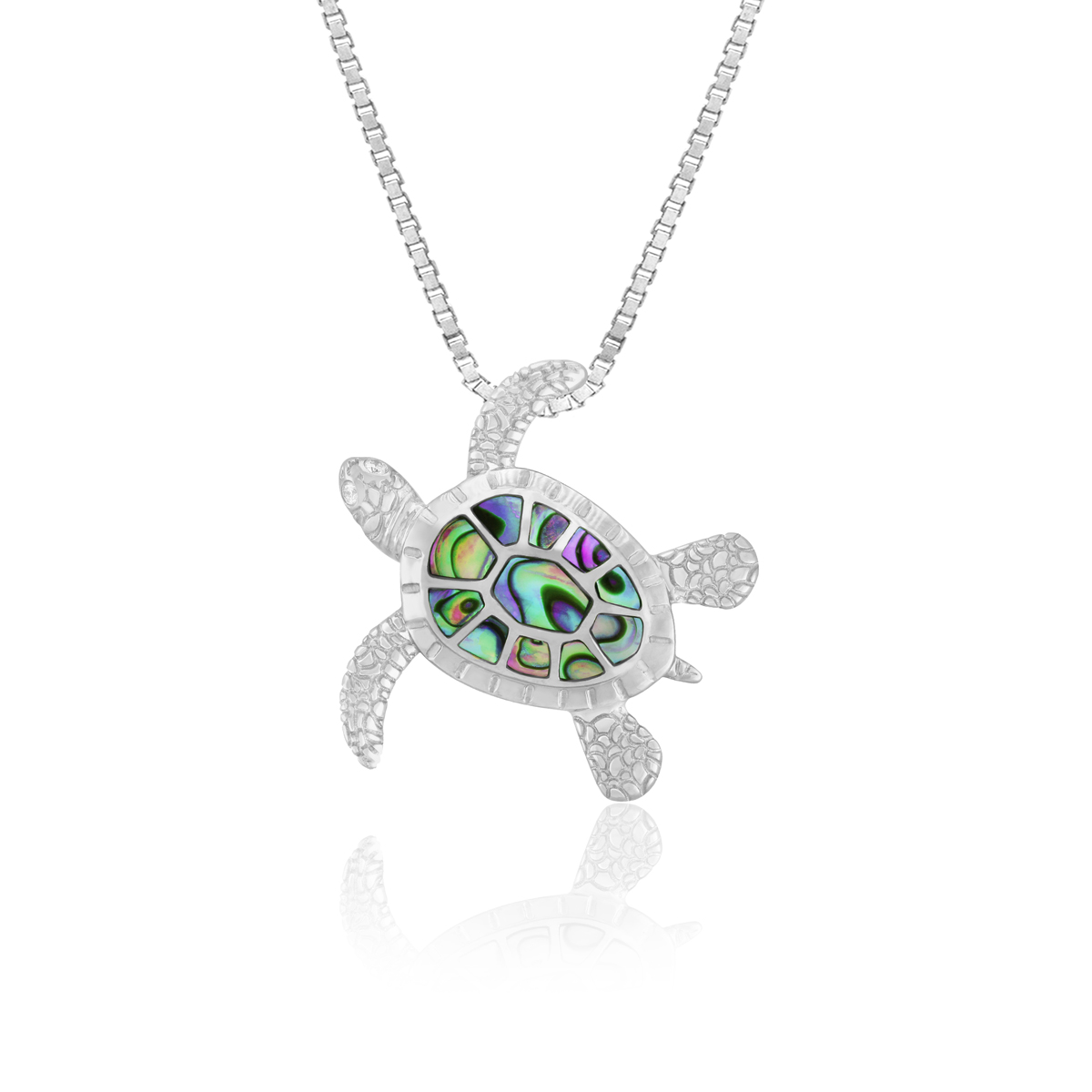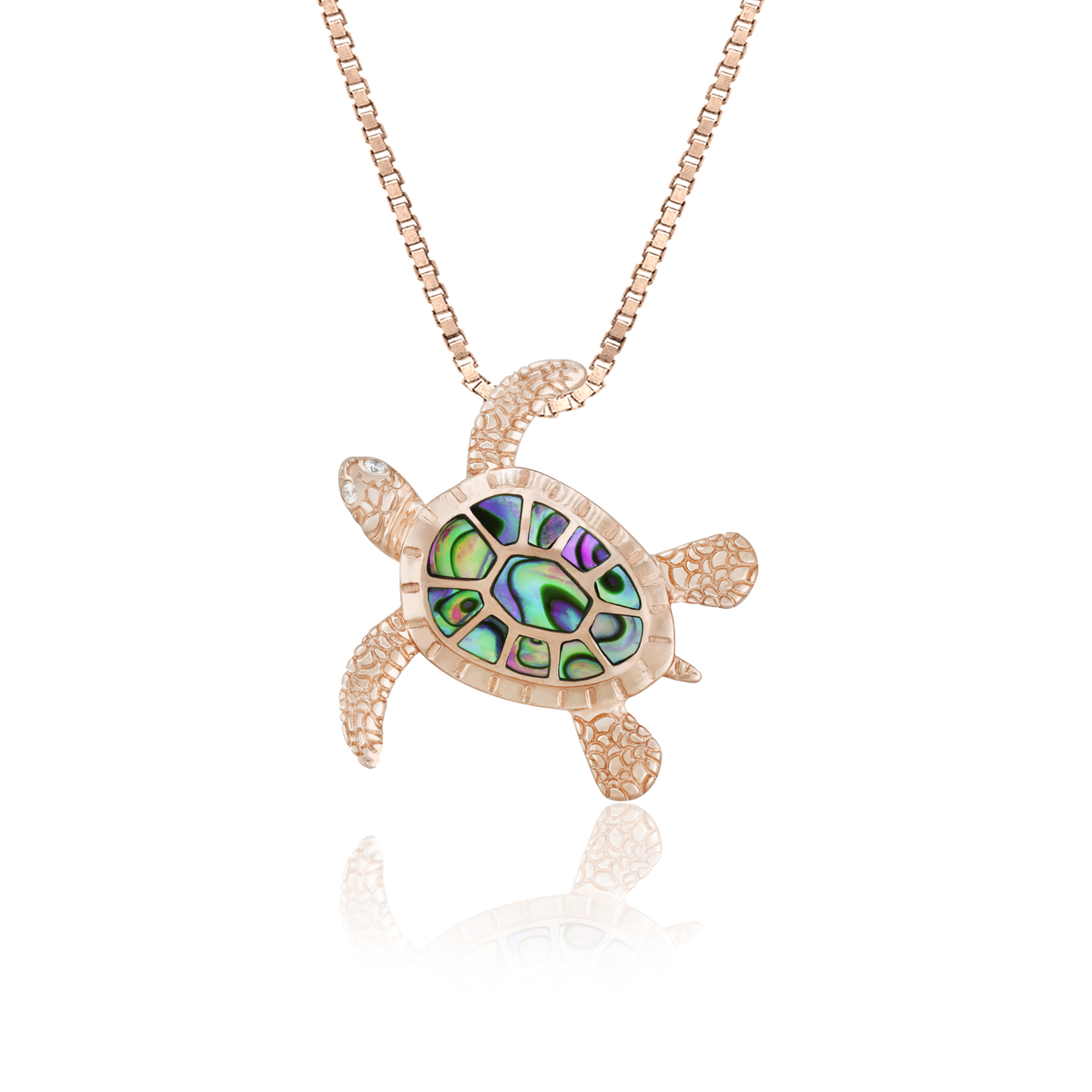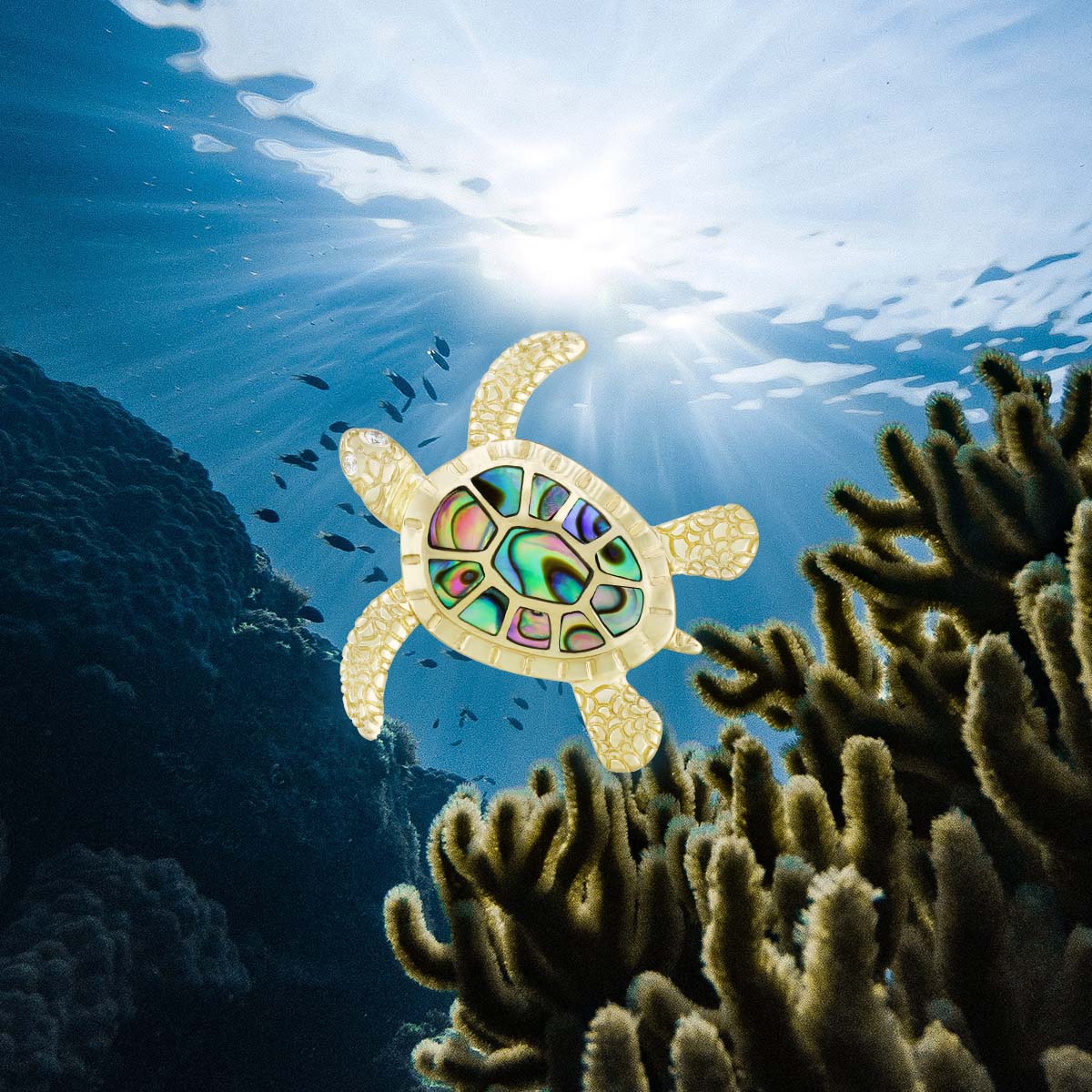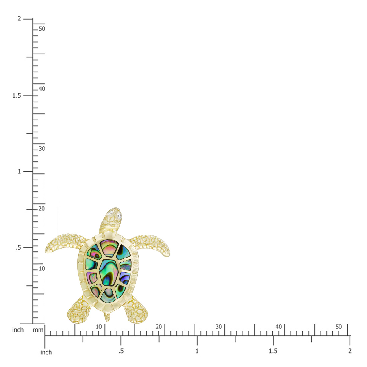 Stunning, Abalone Turtle Gold Pendant. Diamond eye accent 0.01ct. 21mm(4/5″) x 19mm(3/”4). Perfect for everyday wear. From Honolulu, Hawaii.