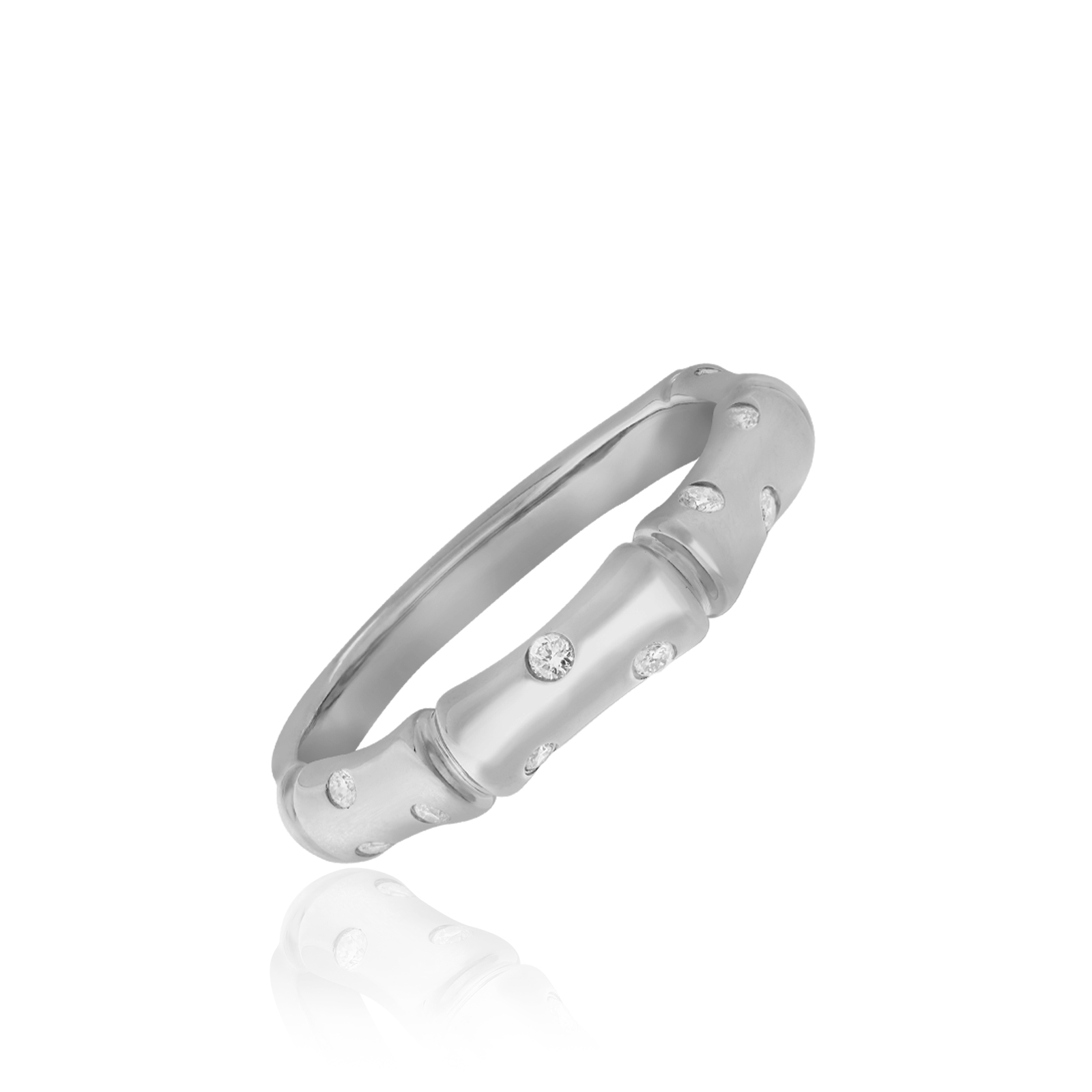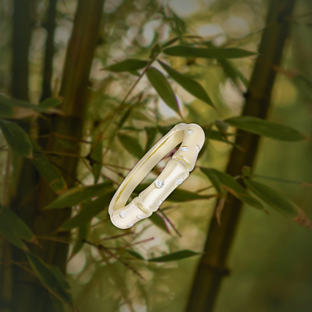 A beautiful, gold bamboo pendant diamond ring. Measures 2mm (approx. 1/10”) x 4mm (approx. 1/8”) with 0.11tcw diamonds. Lifetime guarantee.