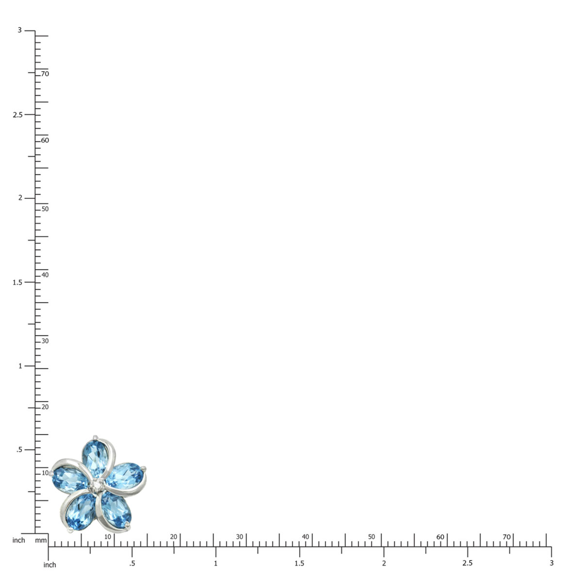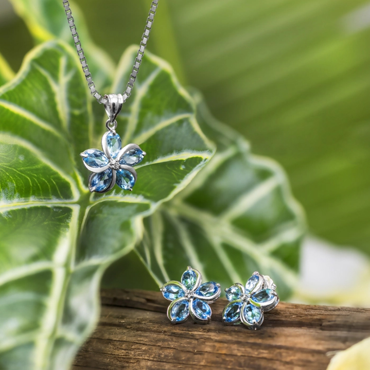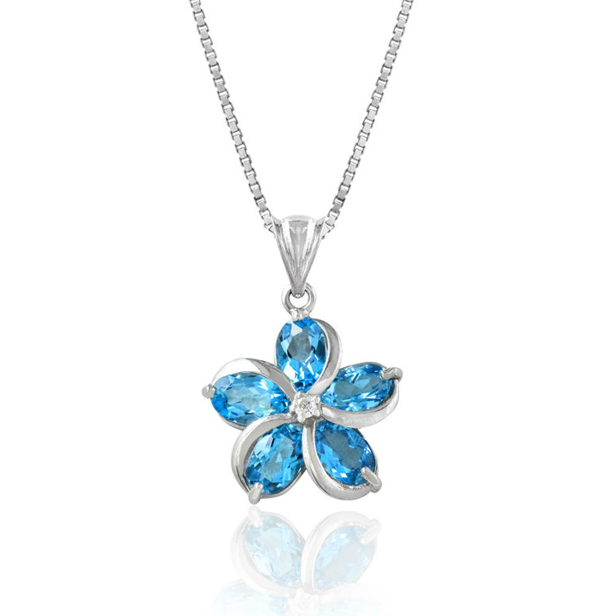 Exquisite sterling silver plumeria necklace with blue topaz petals and a diamond center. Great for everyday wear, or as a gift.