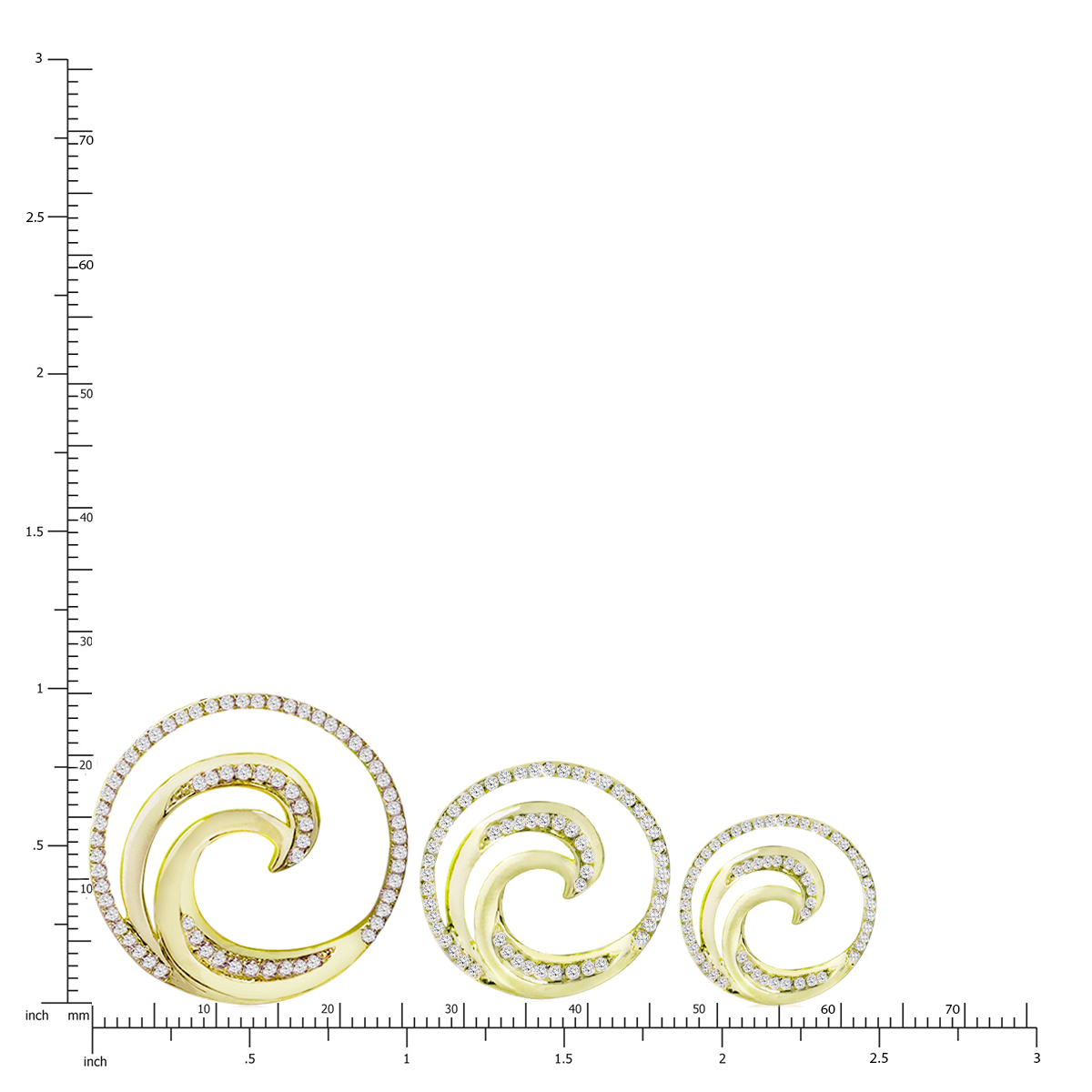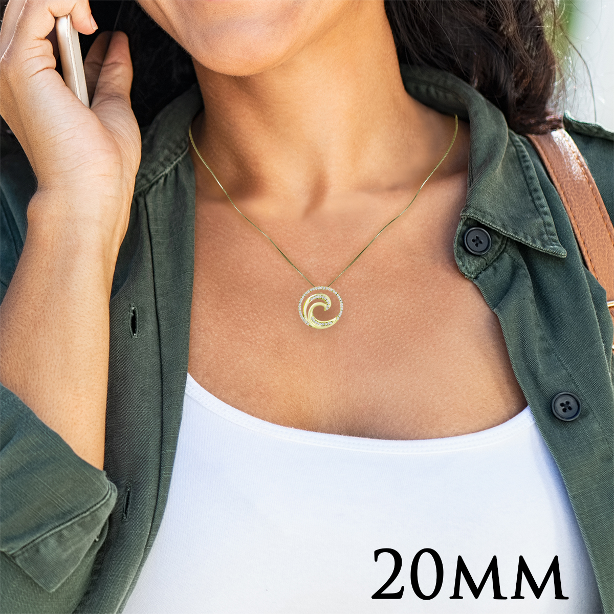 14K gold deluxe diamond wave pendant. Available in 16mm (5/8″) with 0.17ct diamonds, 20mm (2/5″) with 0.25ct diamonds, or 24mm (15/16″) with 0.31ct diamonds. Lifetime guarantee. From Honolulu, Hawaii.