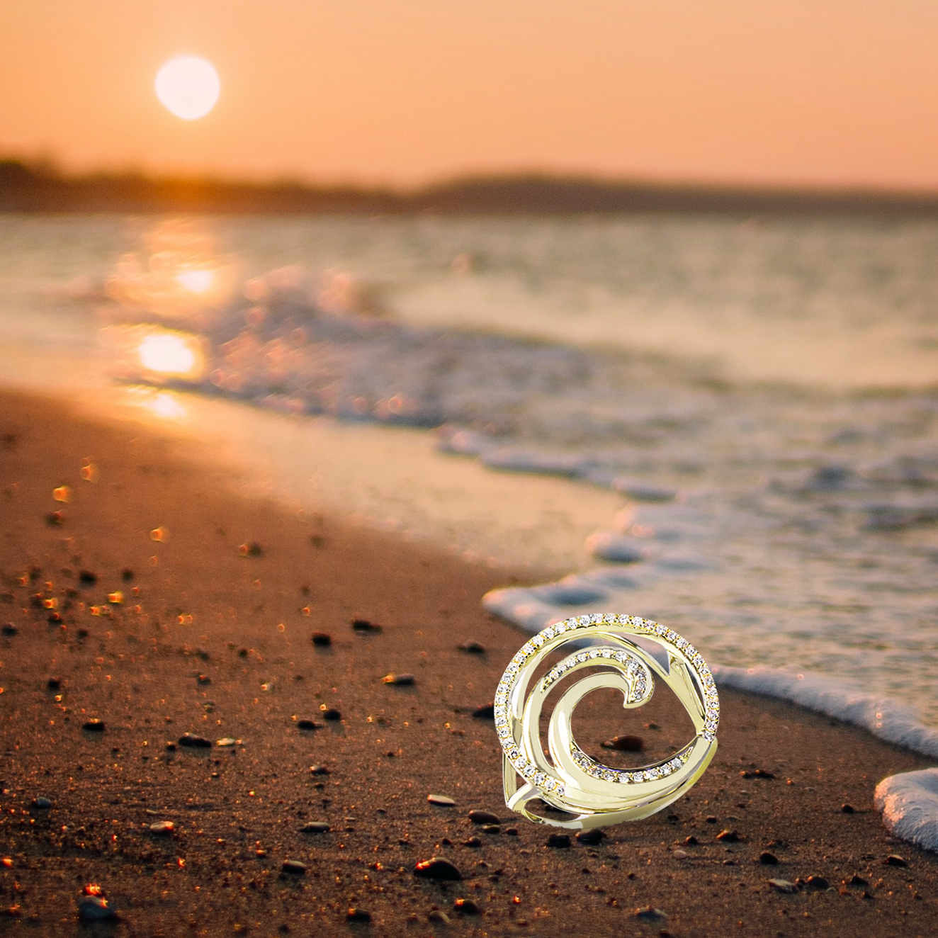 Deluxe 14K gold wave ring with diamonds. Available in 3/4″(19mm) with .25ct diamonds or 5/8″(15mm) with .18ct diamonds. Lifetime guarantee. From Honolulu, Hawaii.