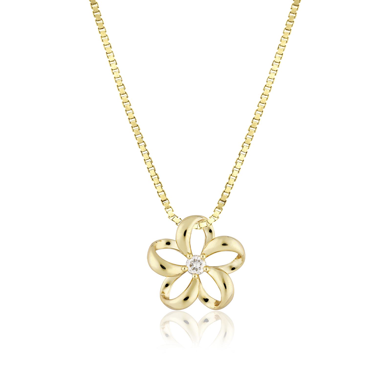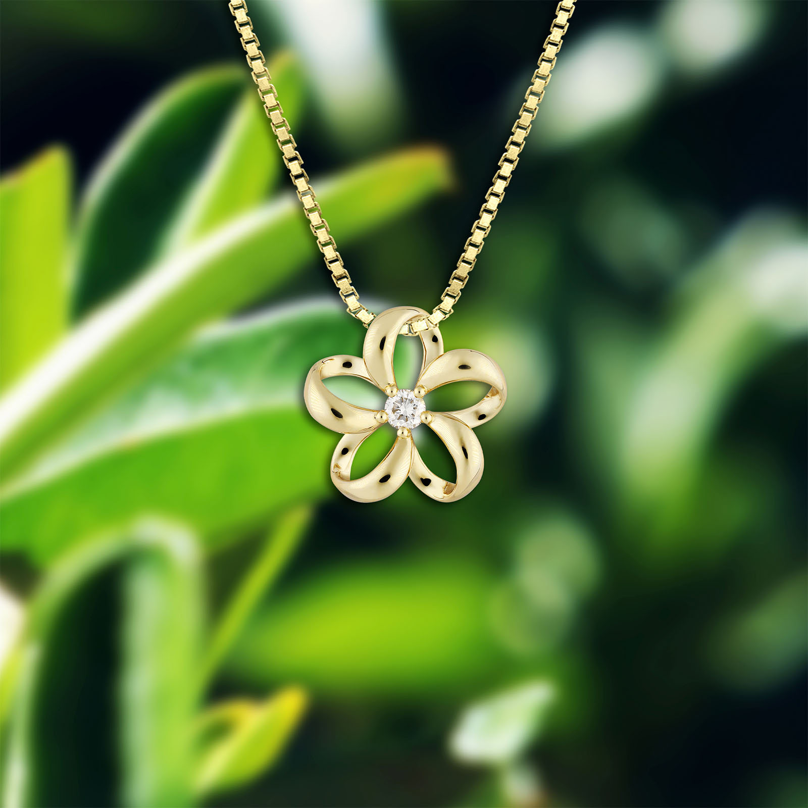 A beautiful, Gold Floating Plumeria Pendant w/ Diamond. 13mm (approx. 3/5″). Accented with 0.07ct diamonds.