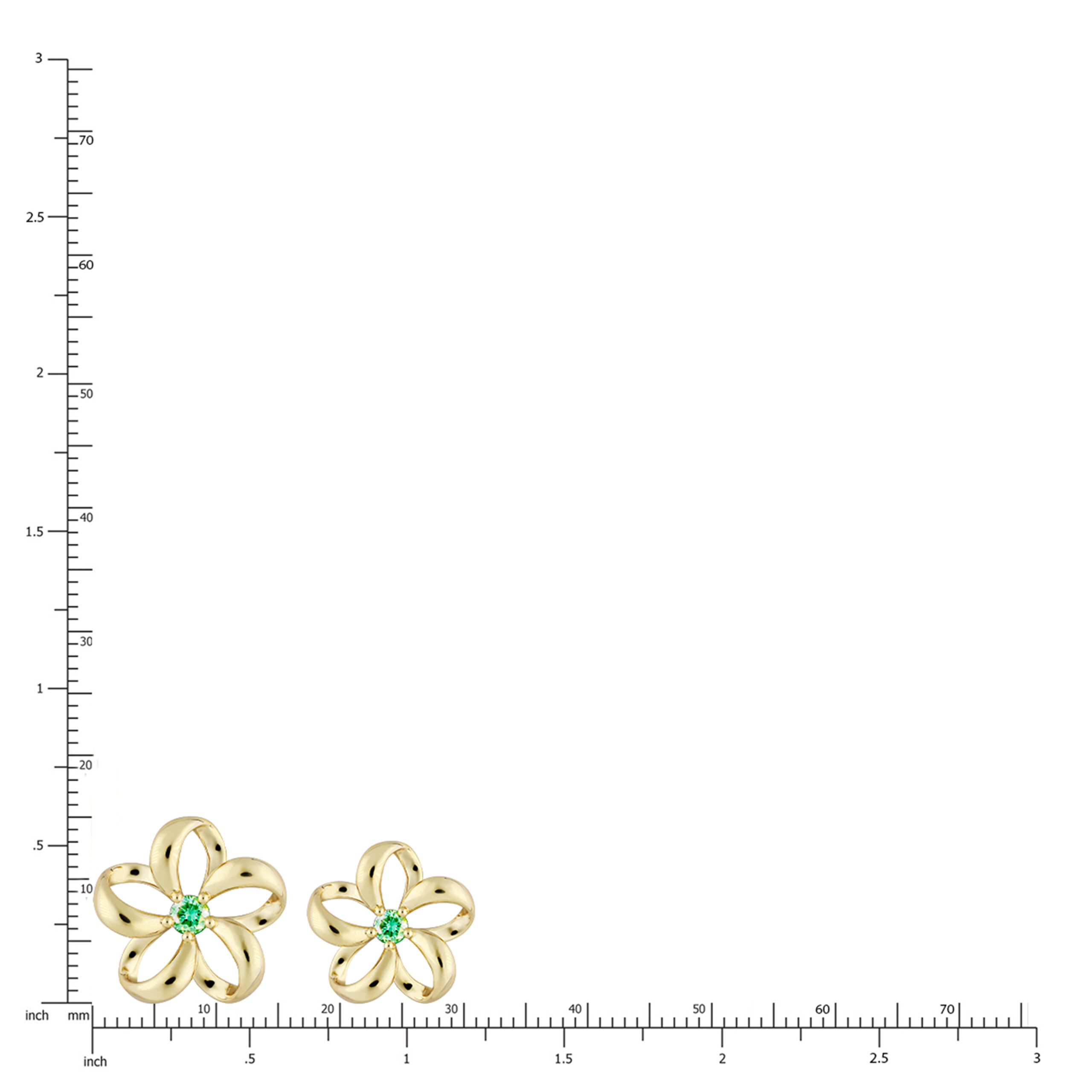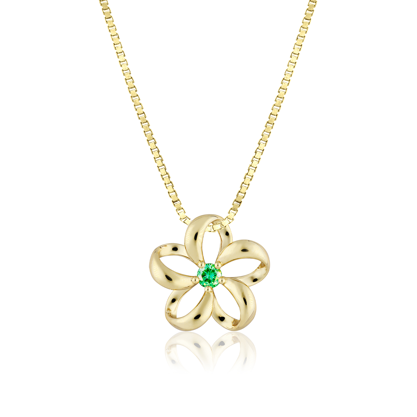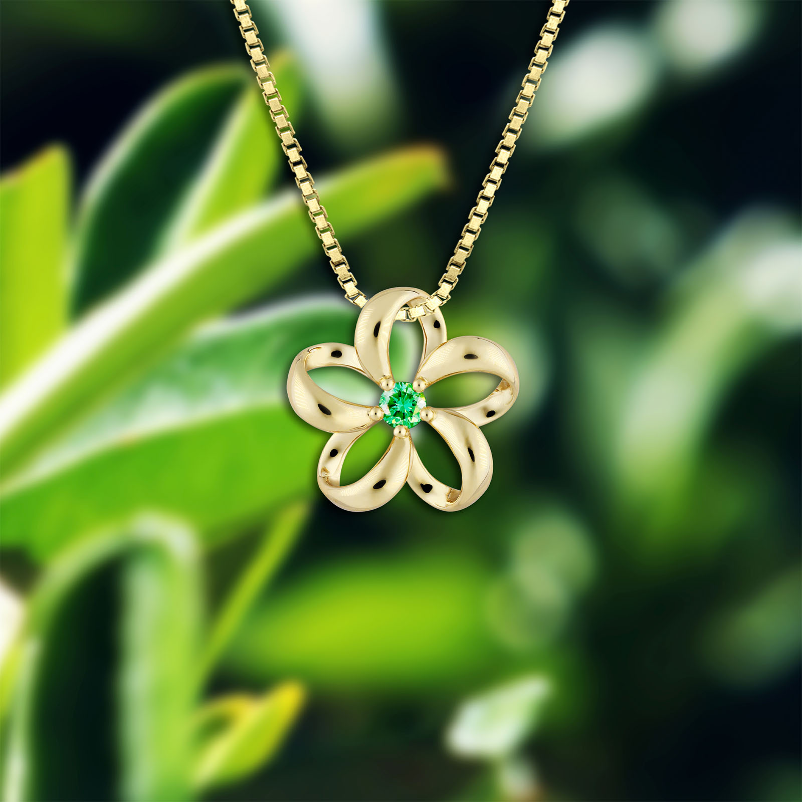 A beautiful, Gold Floating Plumeria Pendant w/ Emerald. 15mm (approx. 3/5″). Accented with 0.15ct Emerald.