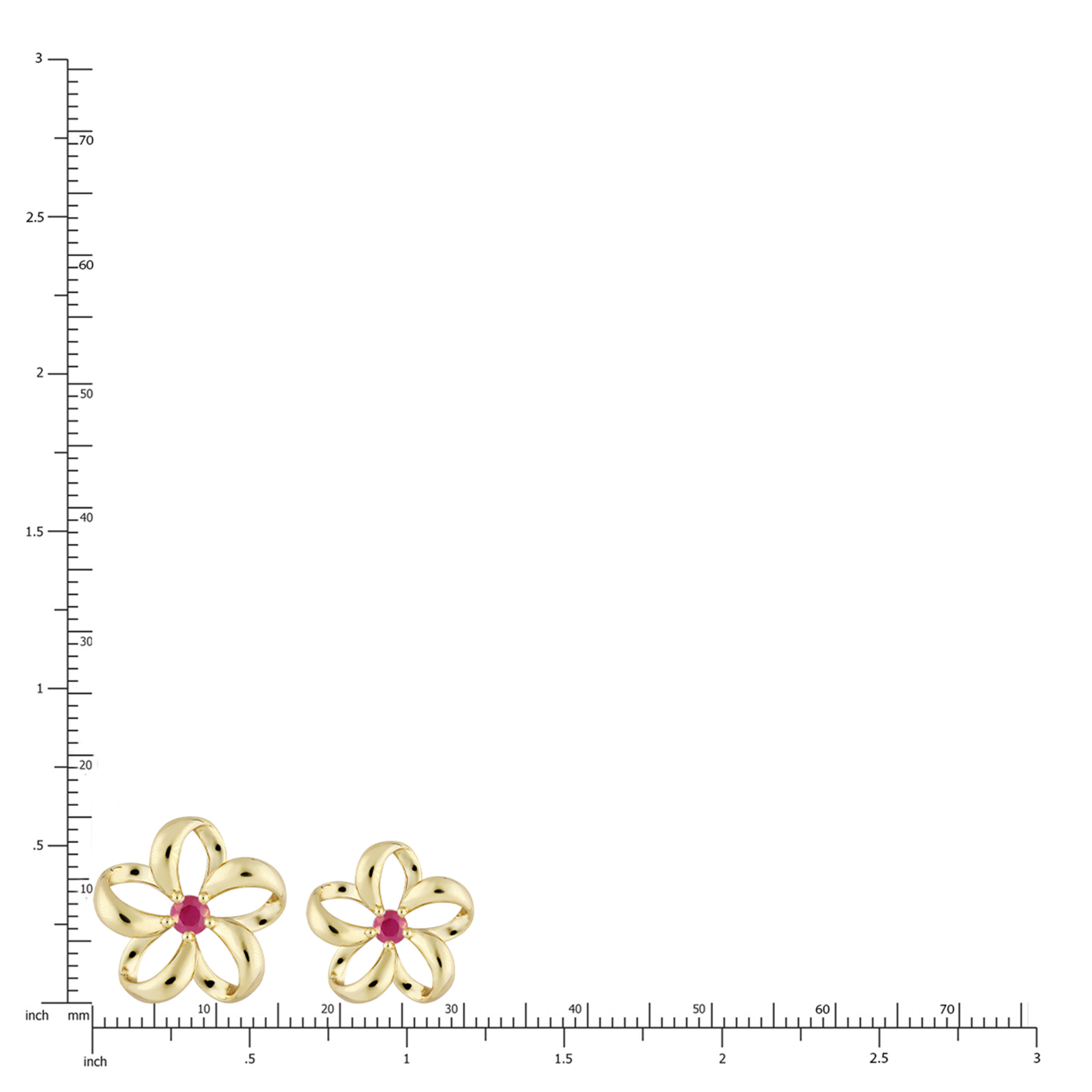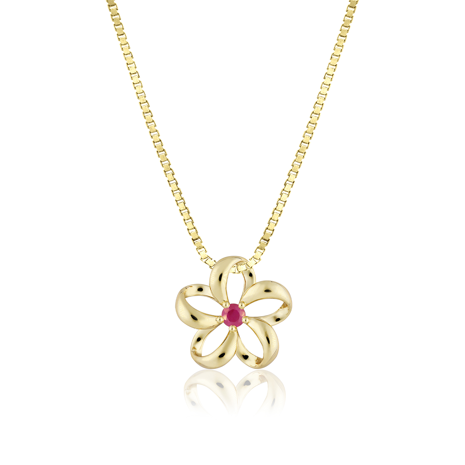 A beautiful, Gold Floating Plumeria Pendant w/ Diamond. 13mm (approx. 3/5″). Accented with 0.07ct ruby.