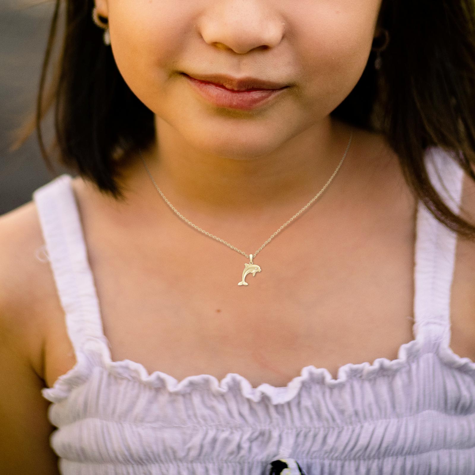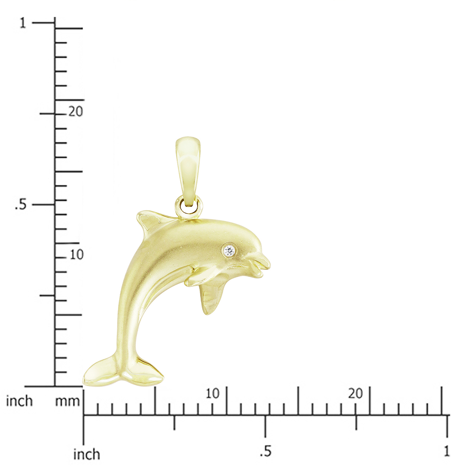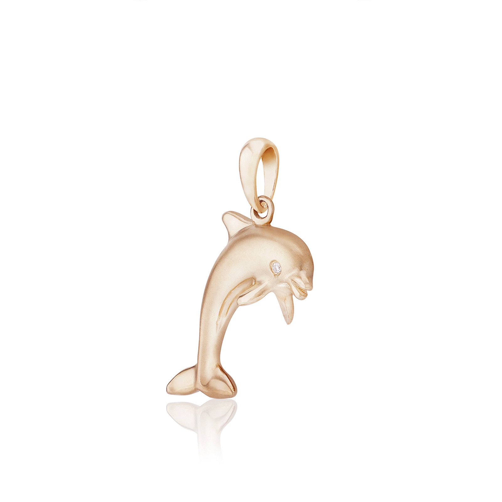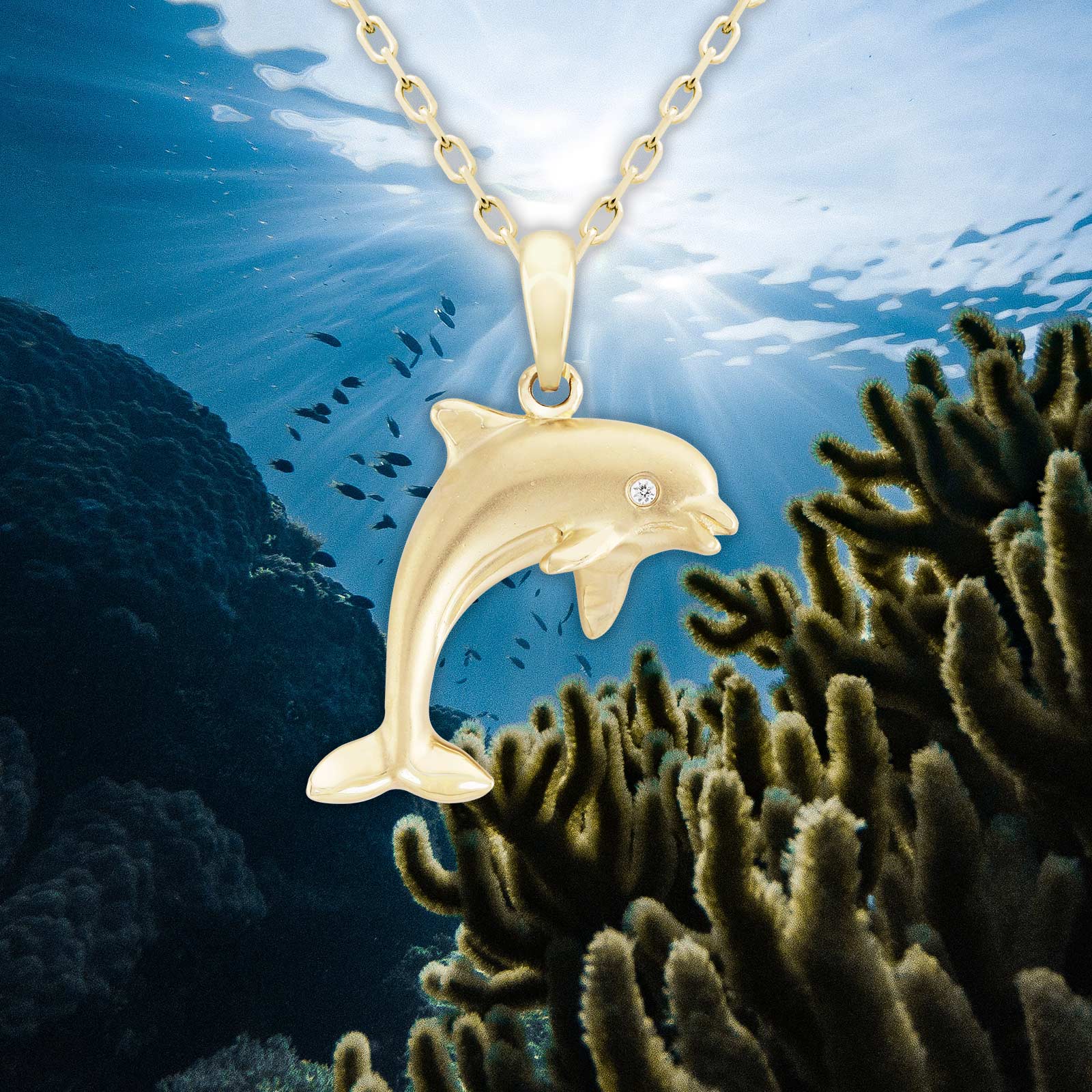 A 14K yellow gold charm pendant of a leaping dolphin. Perfect for everyday wear. Lifetime guarantee. From Honolulu, Hawaii.