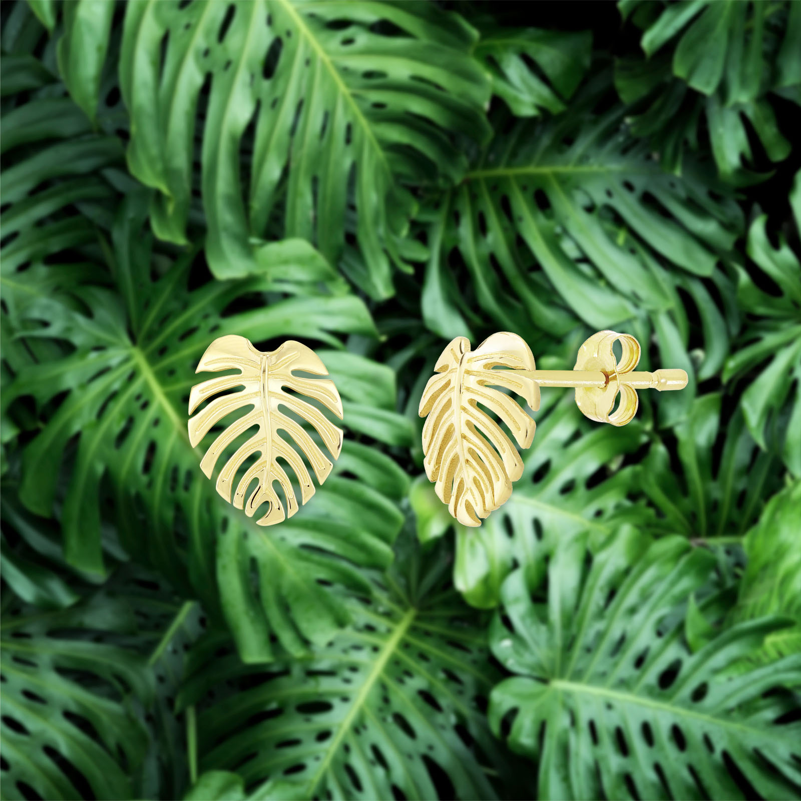 A beautiful, 14k yellow gold Monstera leaf leverback earrings set with cutout detail. Available in yellow, rose, and white gold. 14mm (³⁵/₆₄”). Lifetime guarantee.