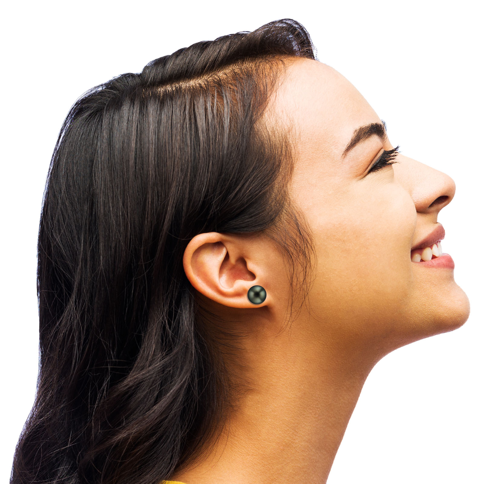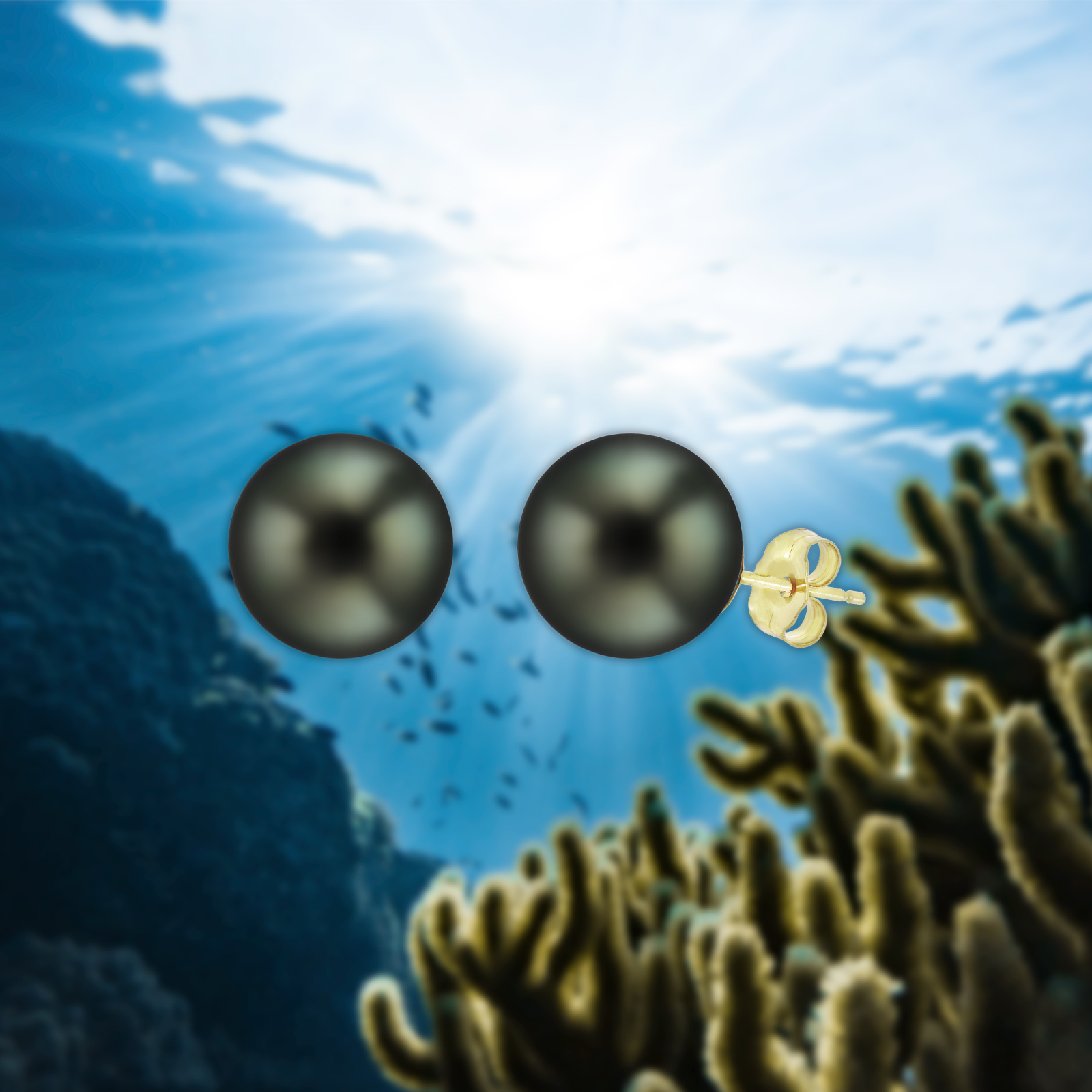 A beautiful, 14K yellow gold Tahitian black pearl stud earring set. Available in 8mm (approx. 5/16″), 9mm (approx. 3/8″), or 10mm (approx. 3/8″).
