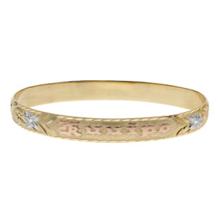 14K Yellow Gold 8mm medium weight bracelet, size 7.5 "ROYAL MONARCH" design with a diamond cut edge. "RIGGS-TIRRE" will be on the outside of the bracelet in raised rose gold lettering. Two flowers will be white gold and set with diamonds.