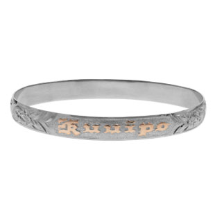 Sterling Silver 8mm heavy weight bracelet, size 8 "PETRO HONU LEAF" design with a smooth border. "" will be on the outside of the bracelet in raised rose gold lettering.