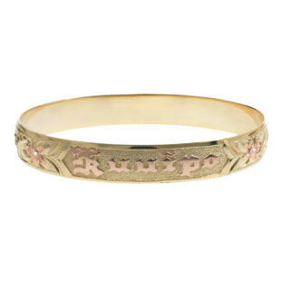 10K Yellow Gold 10mm medium weight bracelet, size 8 "HAWAIIAN KING SCROLL" design with a smooth border. "Hepua " will be on the outside of the bracelet in raised rose gold lettering. Two flowers will be rose gold and set with diamonds. The inside engraving will read: "ALOHA OE "