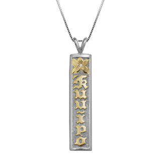 18K White Gold 8mm medium weight pendant with a smooth border. "Tūtū" will be on the outside of the pendant in raised yellow gold lettering. A yellow gold flower will be engraved on the top of this pendant set with a diamond. The backside engraving will read: "KAIA & NOAH" This will come with a […]