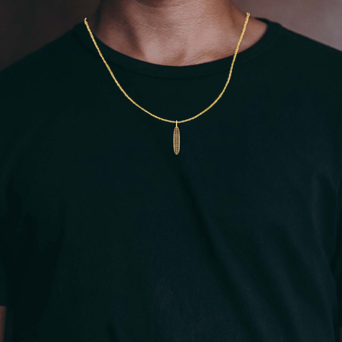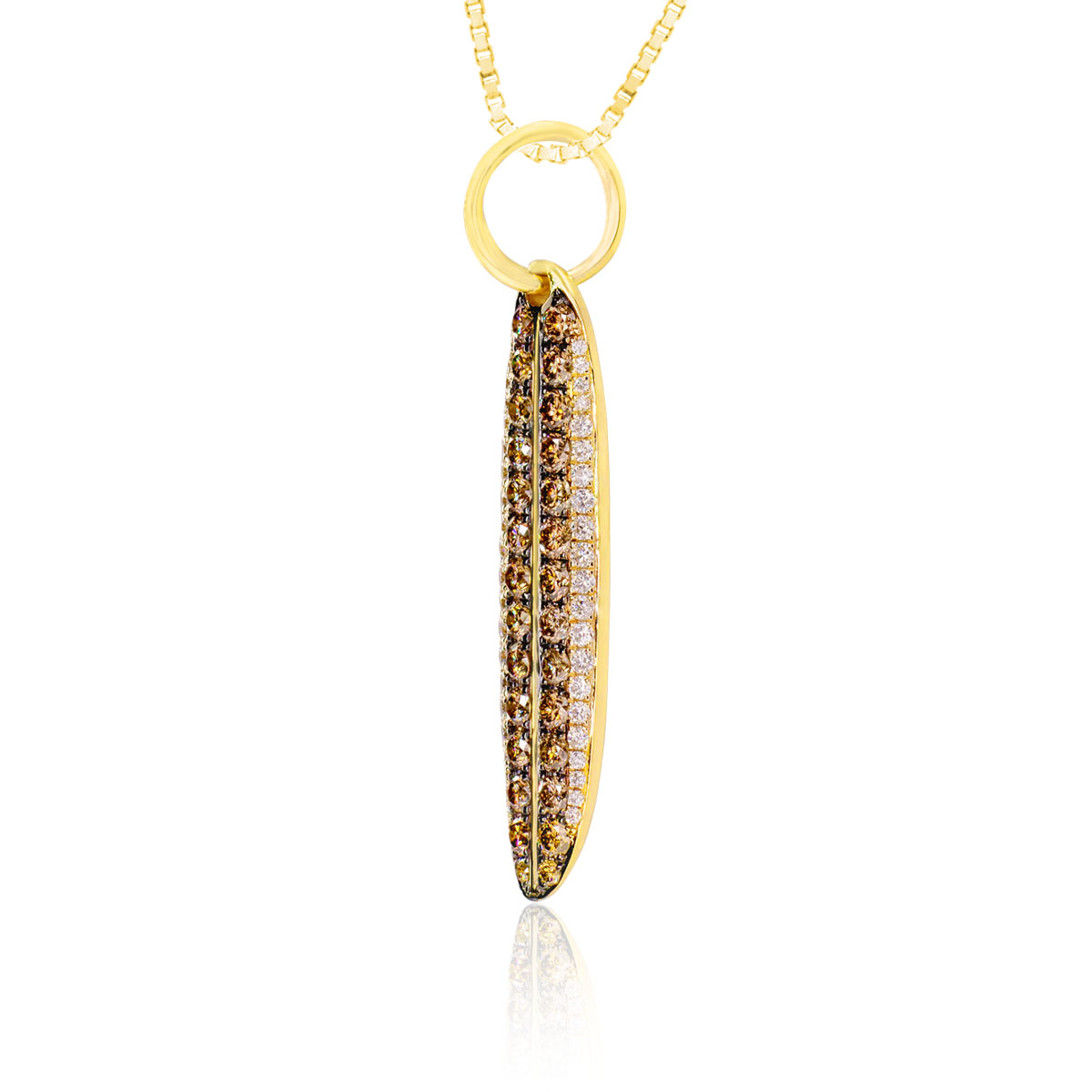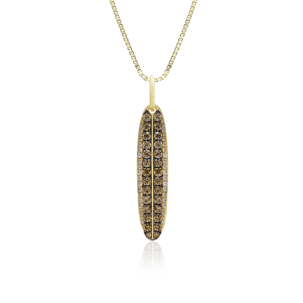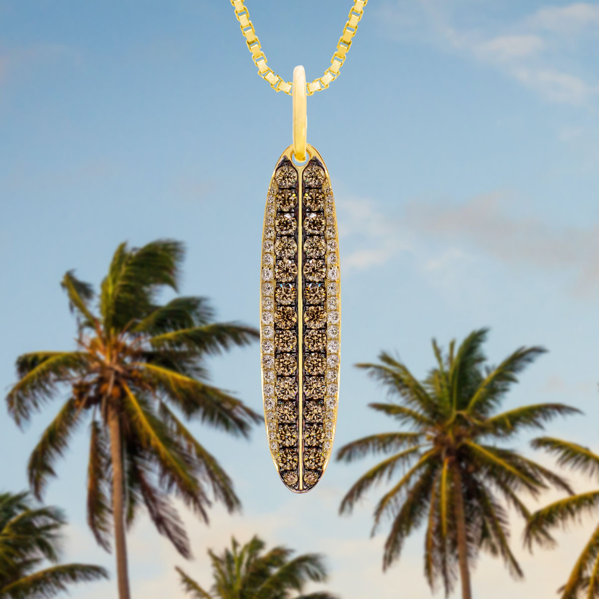 14K yellow gold surfboard pendant with diamond and koa diamond® accents. Pendant is 31mm (1 1/4″) by 7mm (1/4″) by 3mm (1/10″). 1.00ct Koa Diamonds and 0.25ct diamonds. From Honolulu, Hawaii.