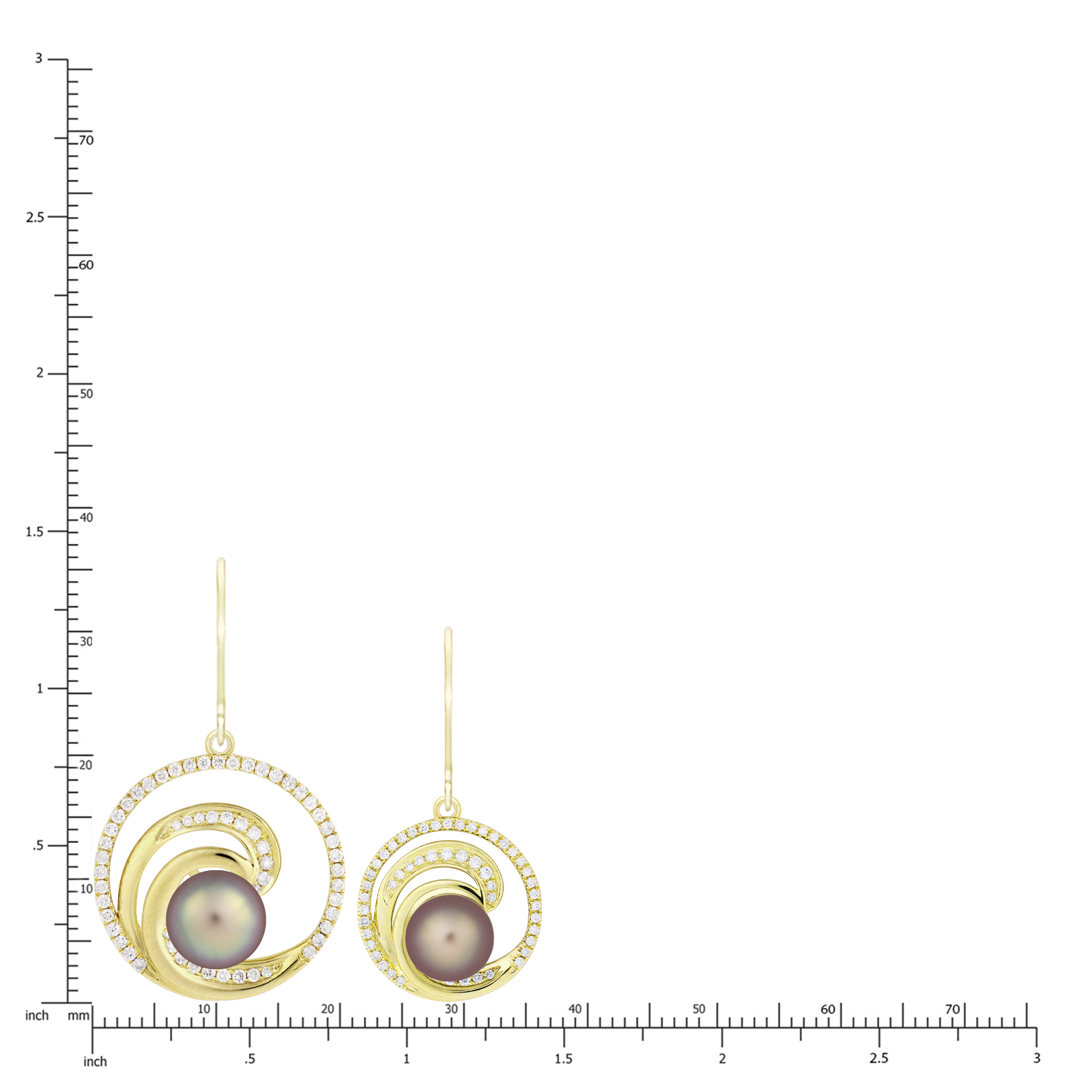 Diamond wave white gold earrings set with Tahitian pearl centers. 20mm with .47ct diamonds and 8mm Tahitian pearl. From Honolulu, Hawaii.