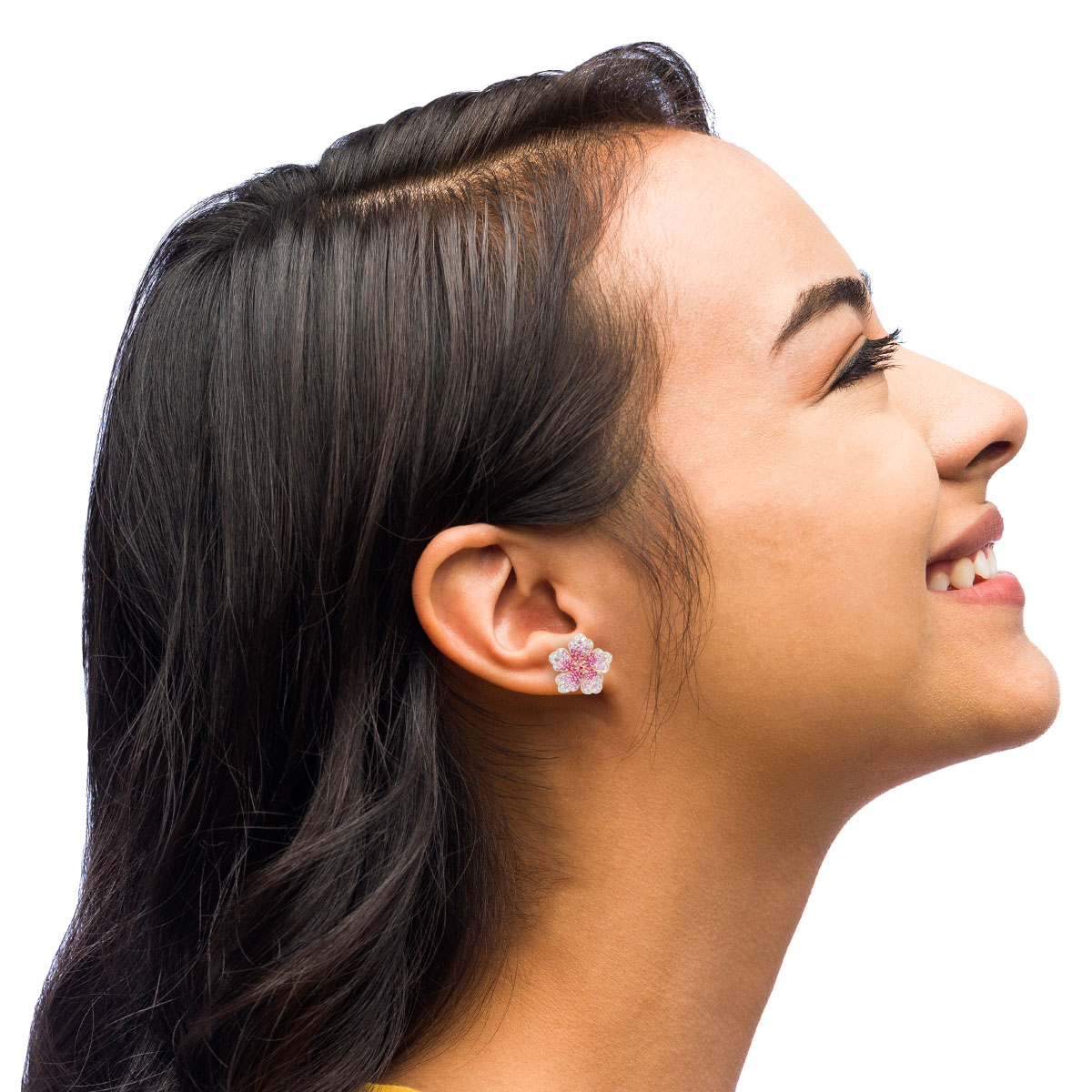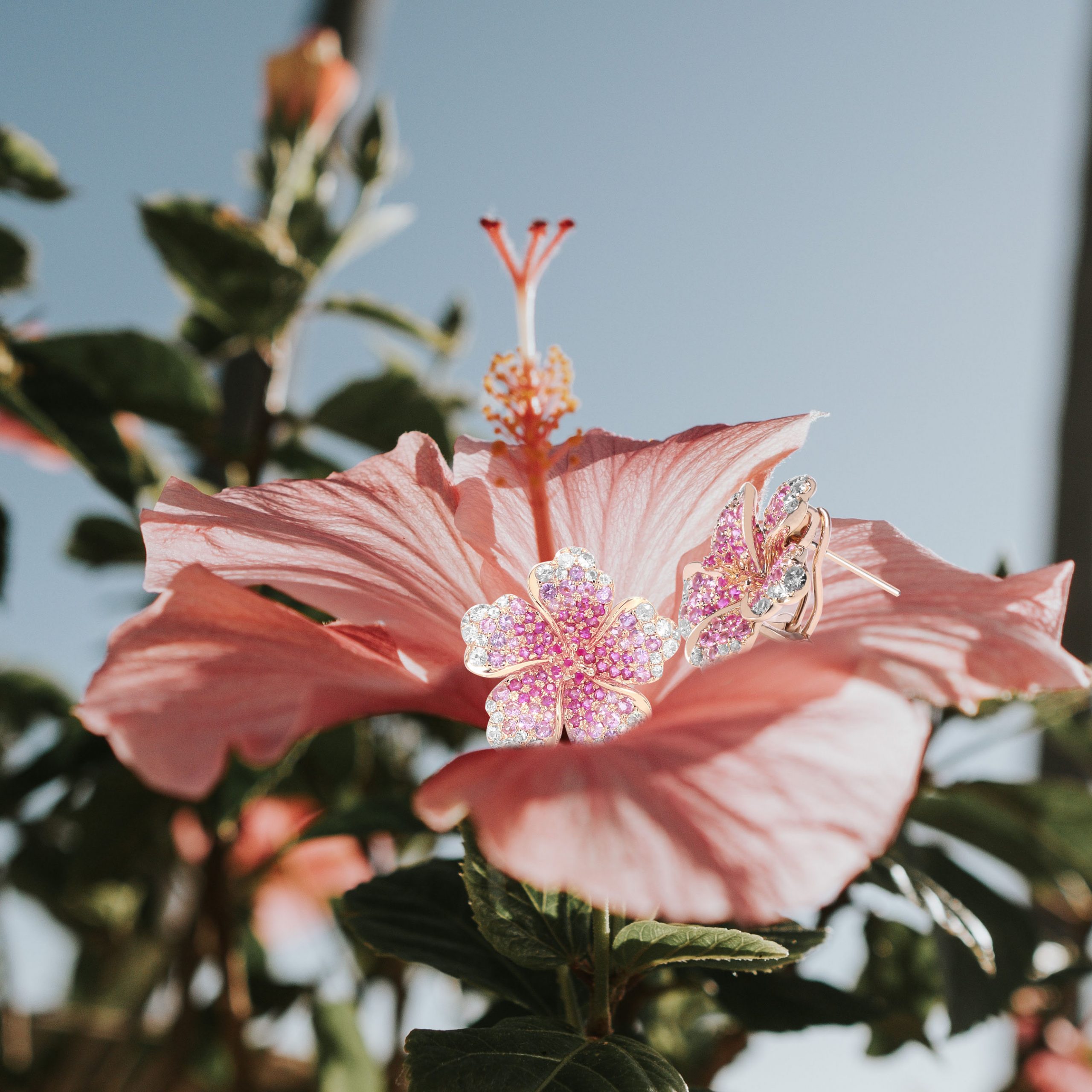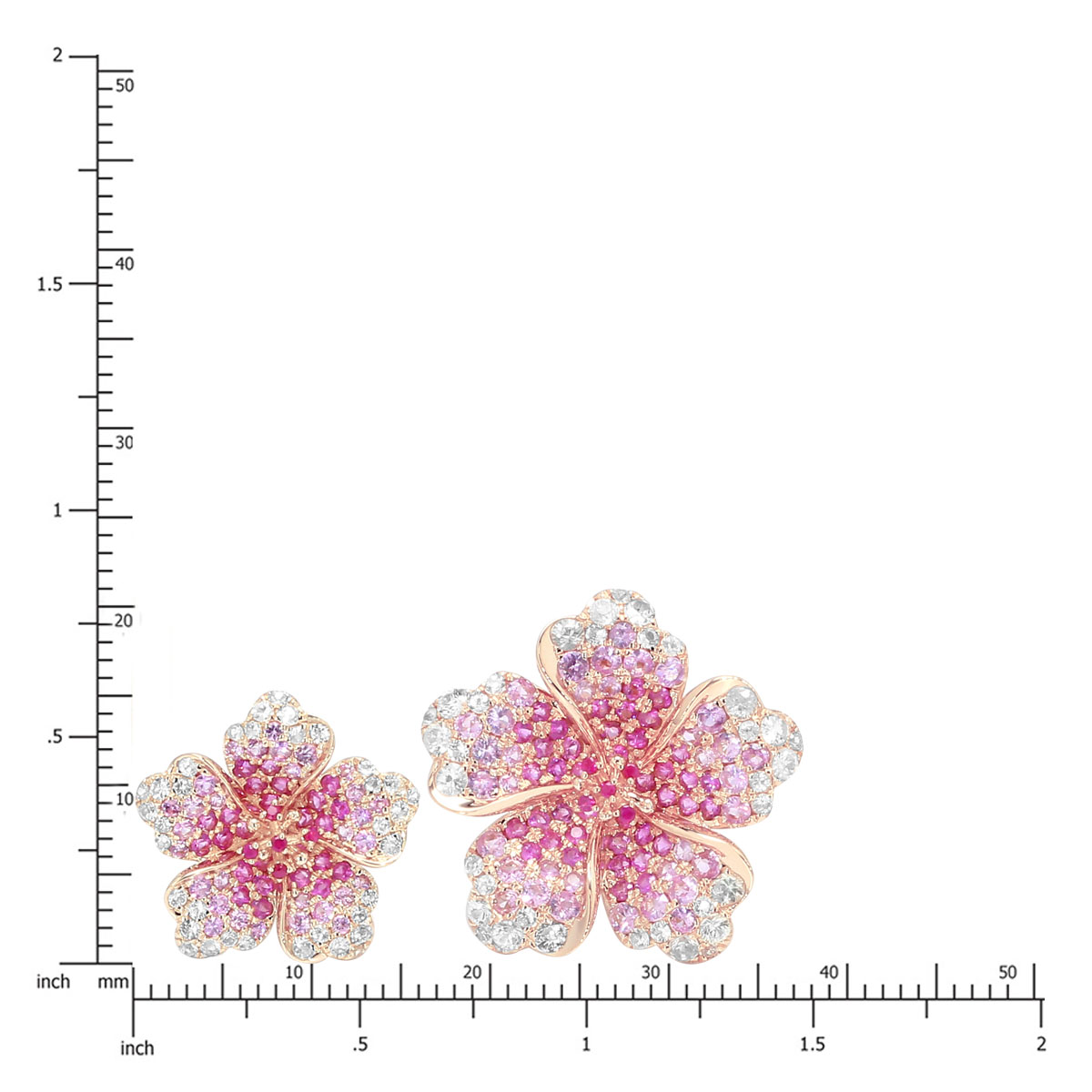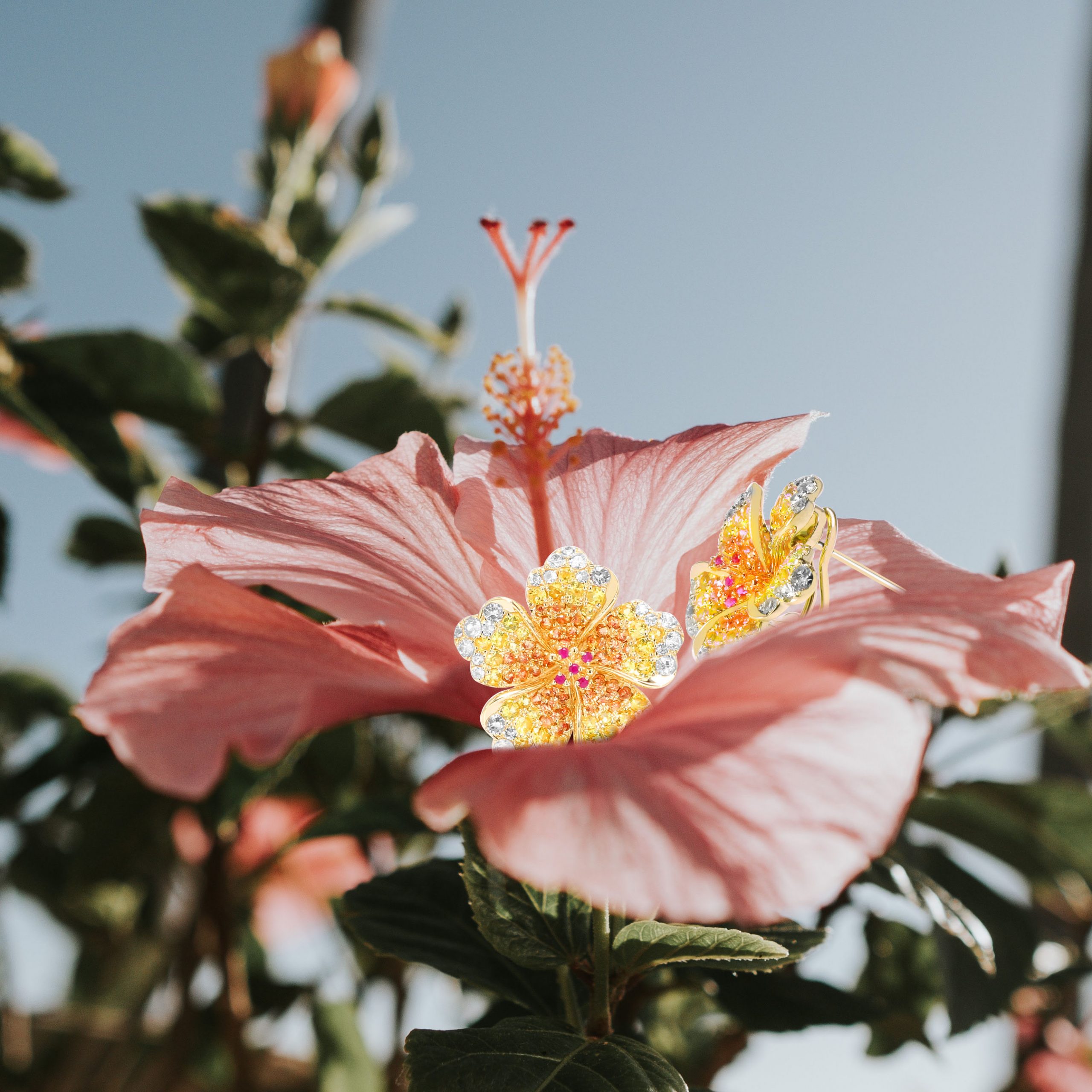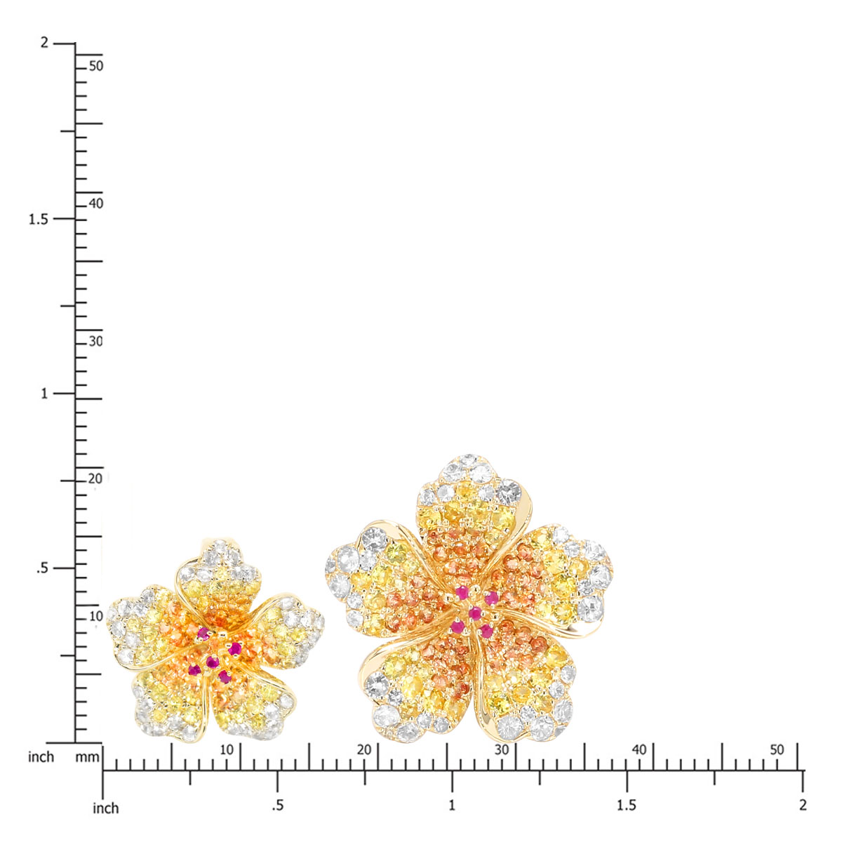 14k Yellow Gold Ombre Hibiscus Gemstone Earrings. Gemstones in yellow sapphire and white sapphire. Earring Sizes available in 19/32″ (15mm x 16mm) with stud backing.