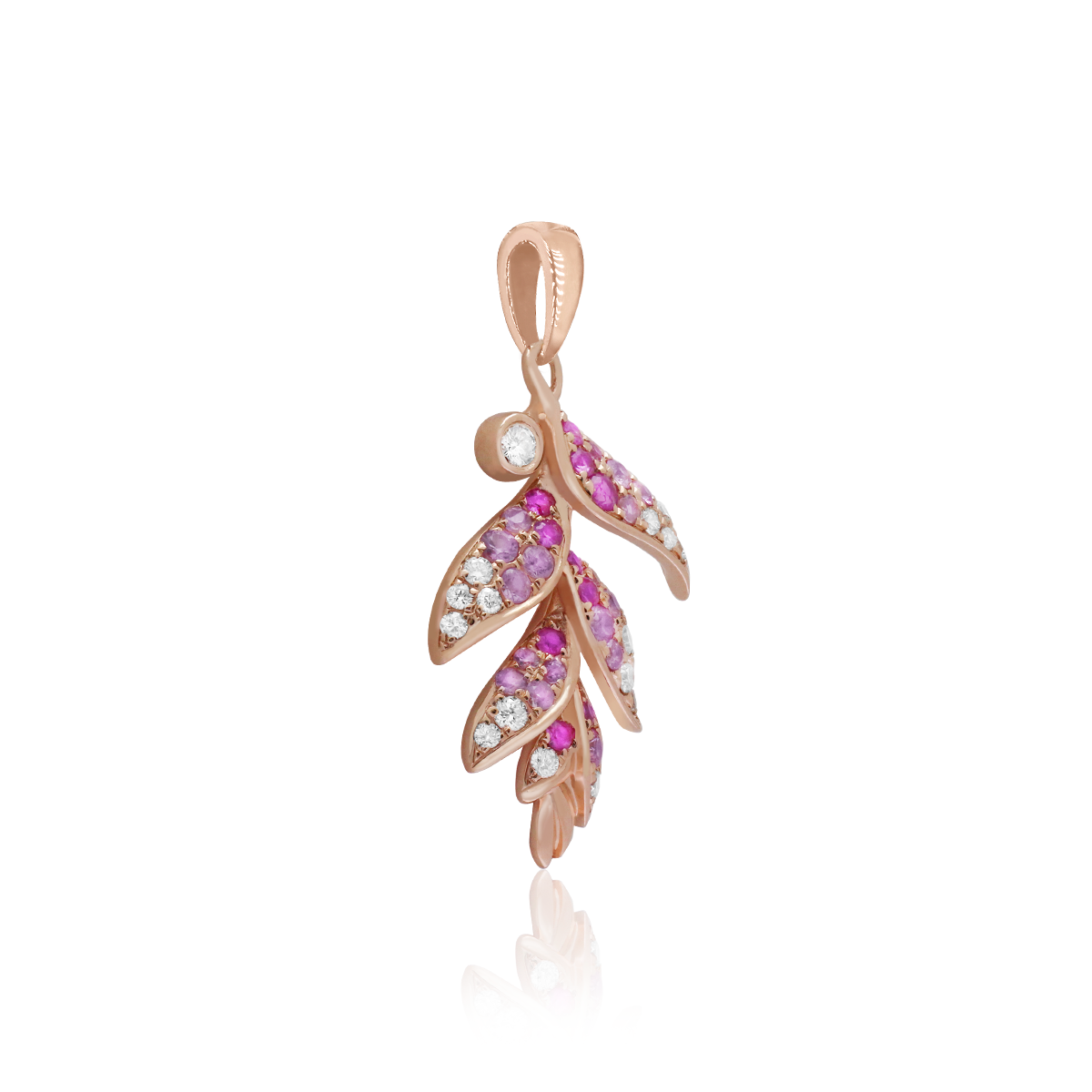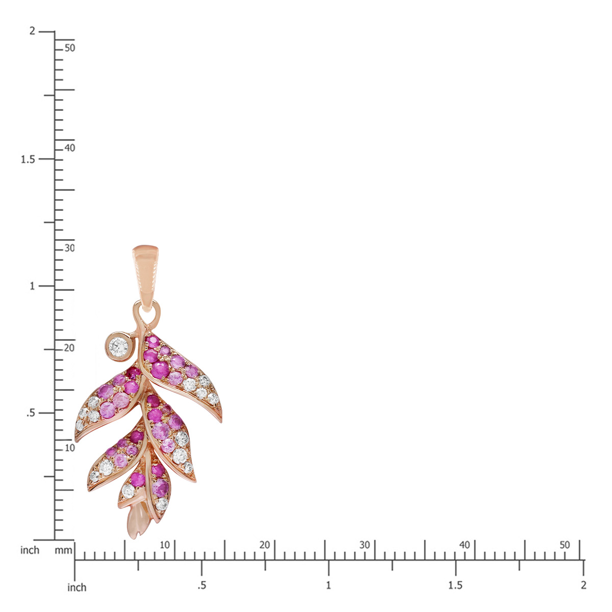 Stunning pink sapphire Heliconia rose gold pendant with diamond accent. 24mm(15/16”) x 15mm(approx. 3/5″). 0.47ct pink sapphires and 0.2ct diamonds From Honolulu, Hawaii.