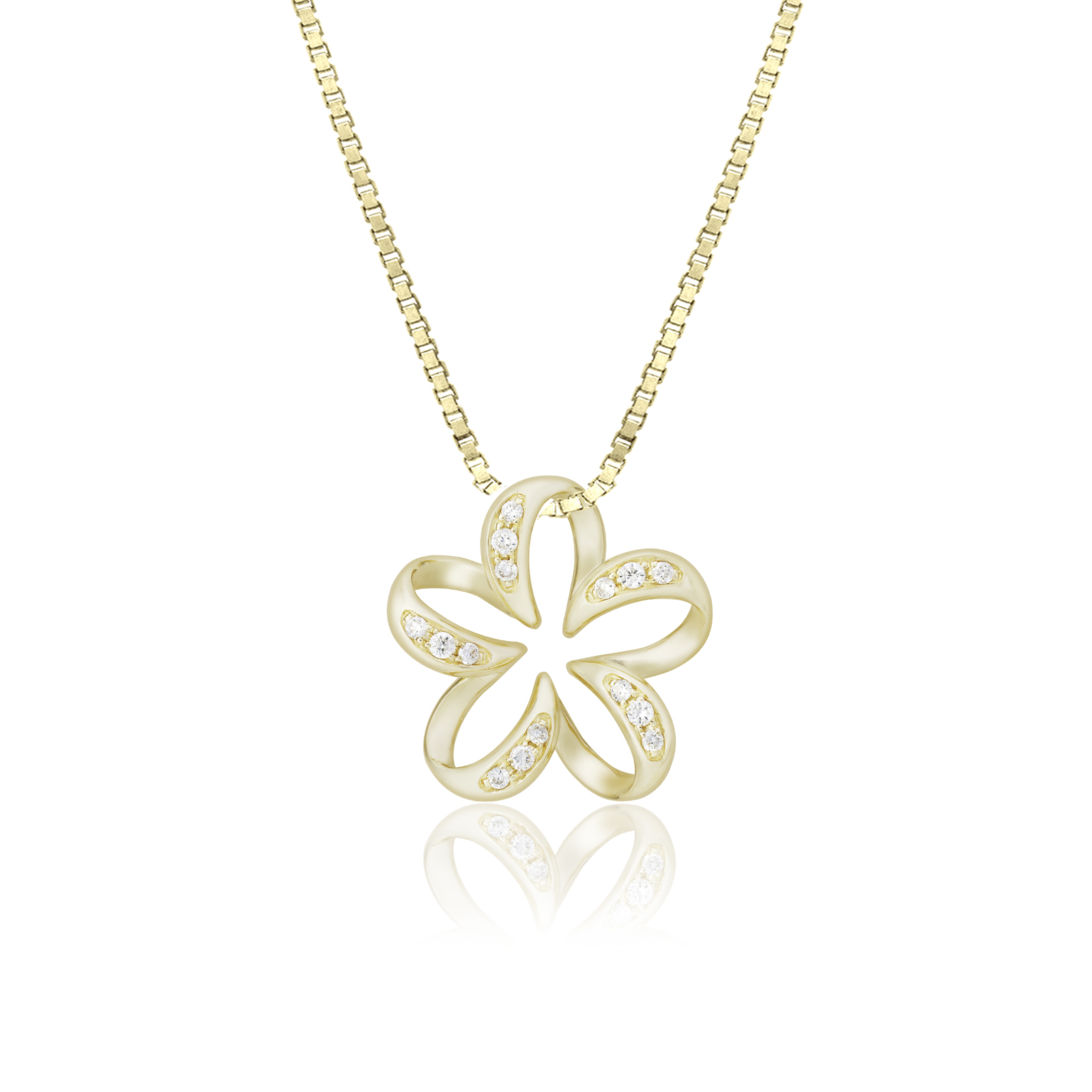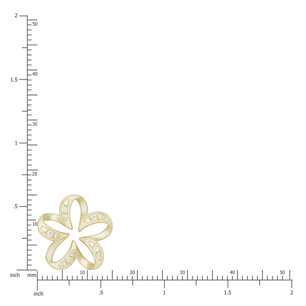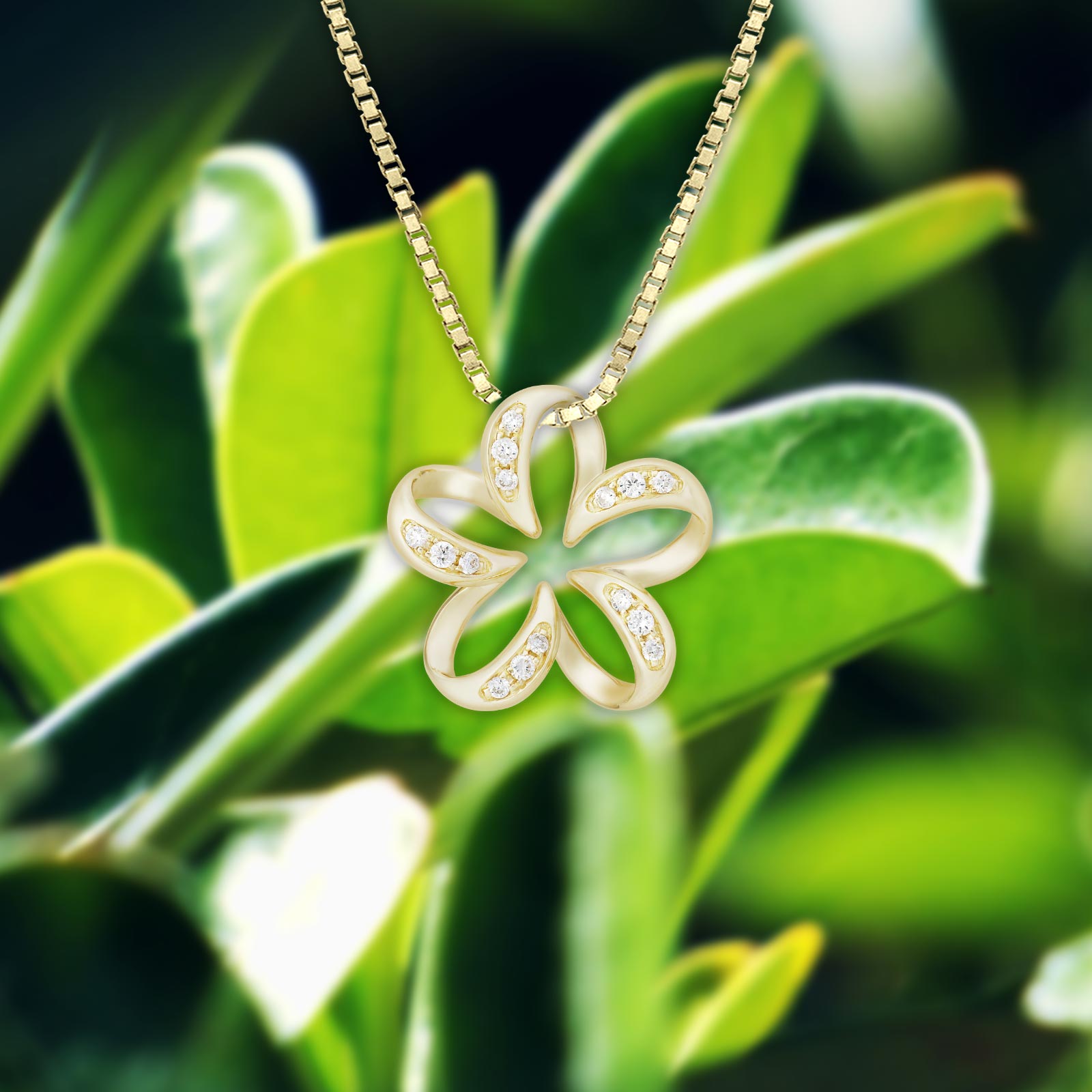 A beautiful, 14K solid gold plumeria contour diamond pendant. Available in 13mm (1/2″), 15mm (approx. 3/5″), 18mm (approx. 7/10″). Accented with 0.05ct, 0.08ct, or 0.13ct diamonds.