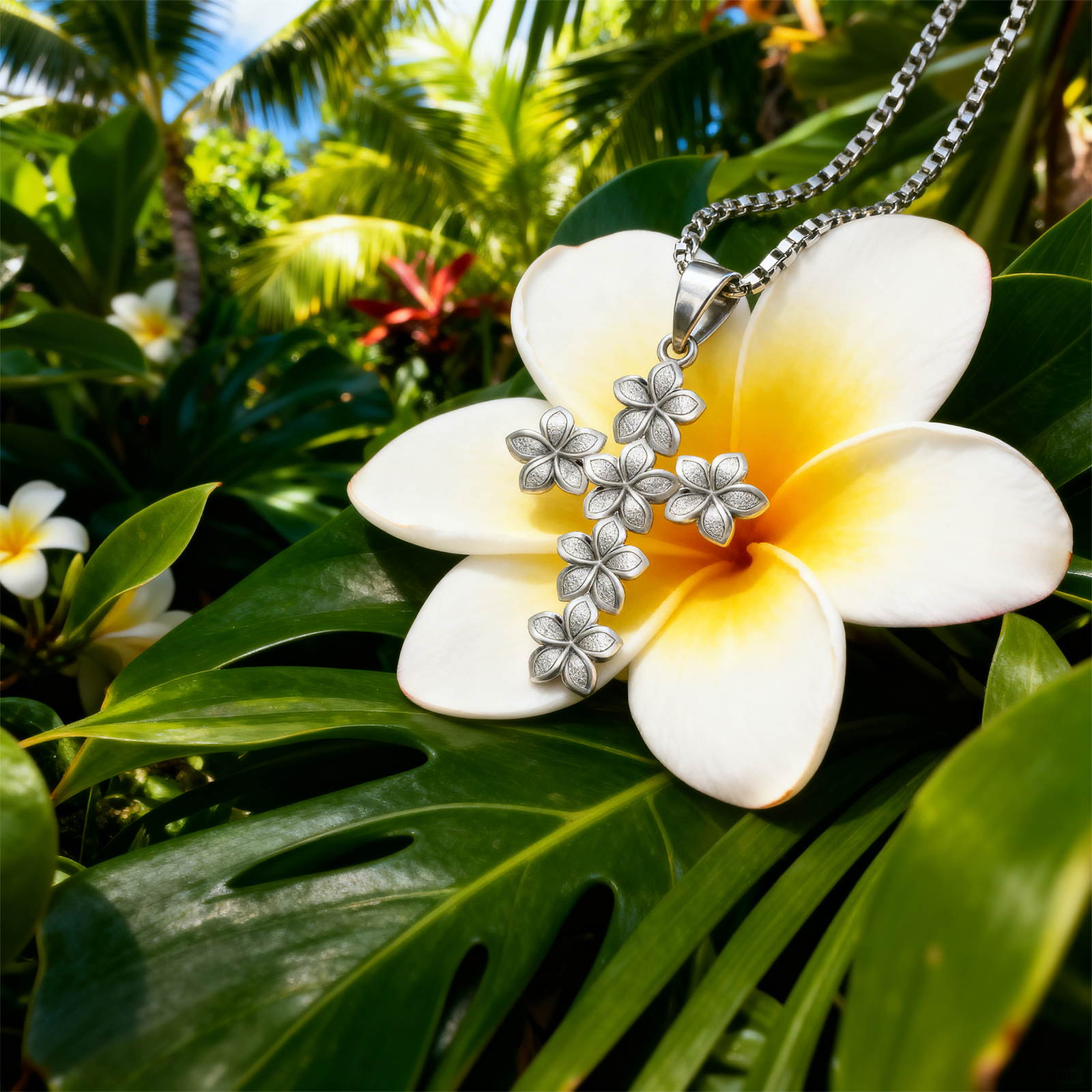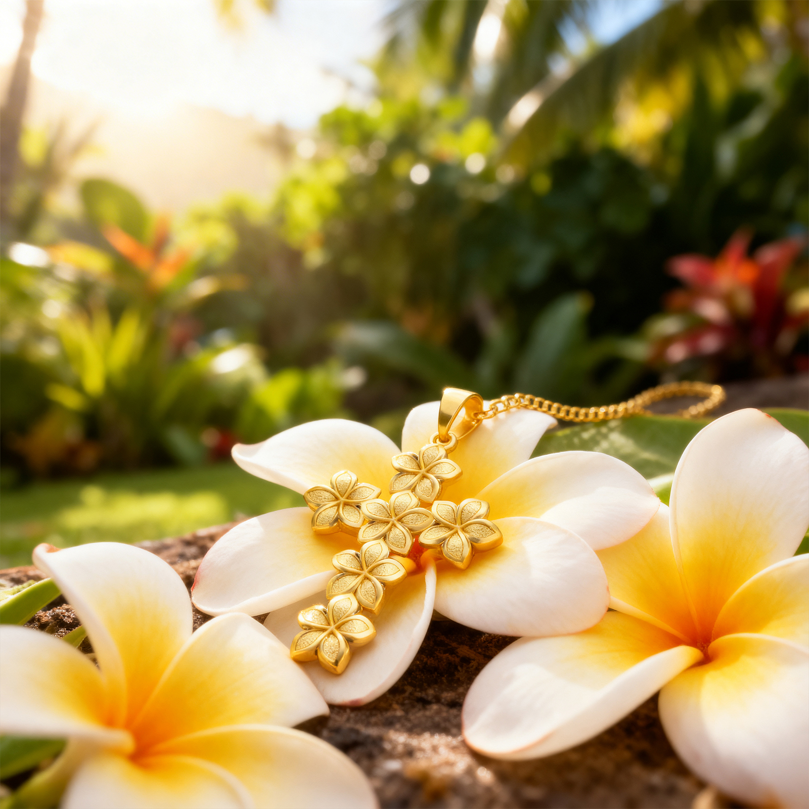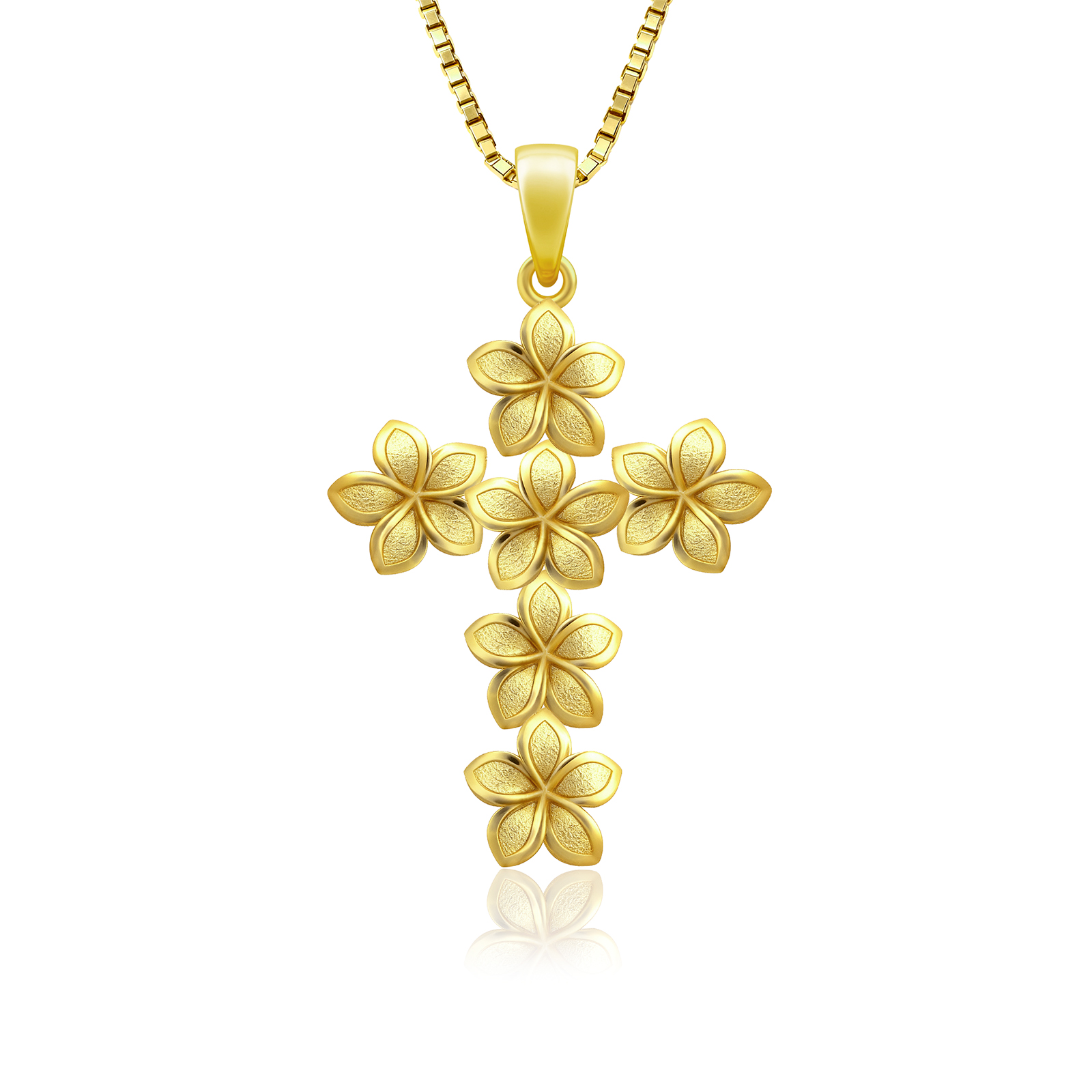Plumeria Cross Pendant. Beautiful, 14K yellow gold Plumeria Cross. 29mm high and 20mm wide. Perfect for everyday wear. Lifetime guarantee.
