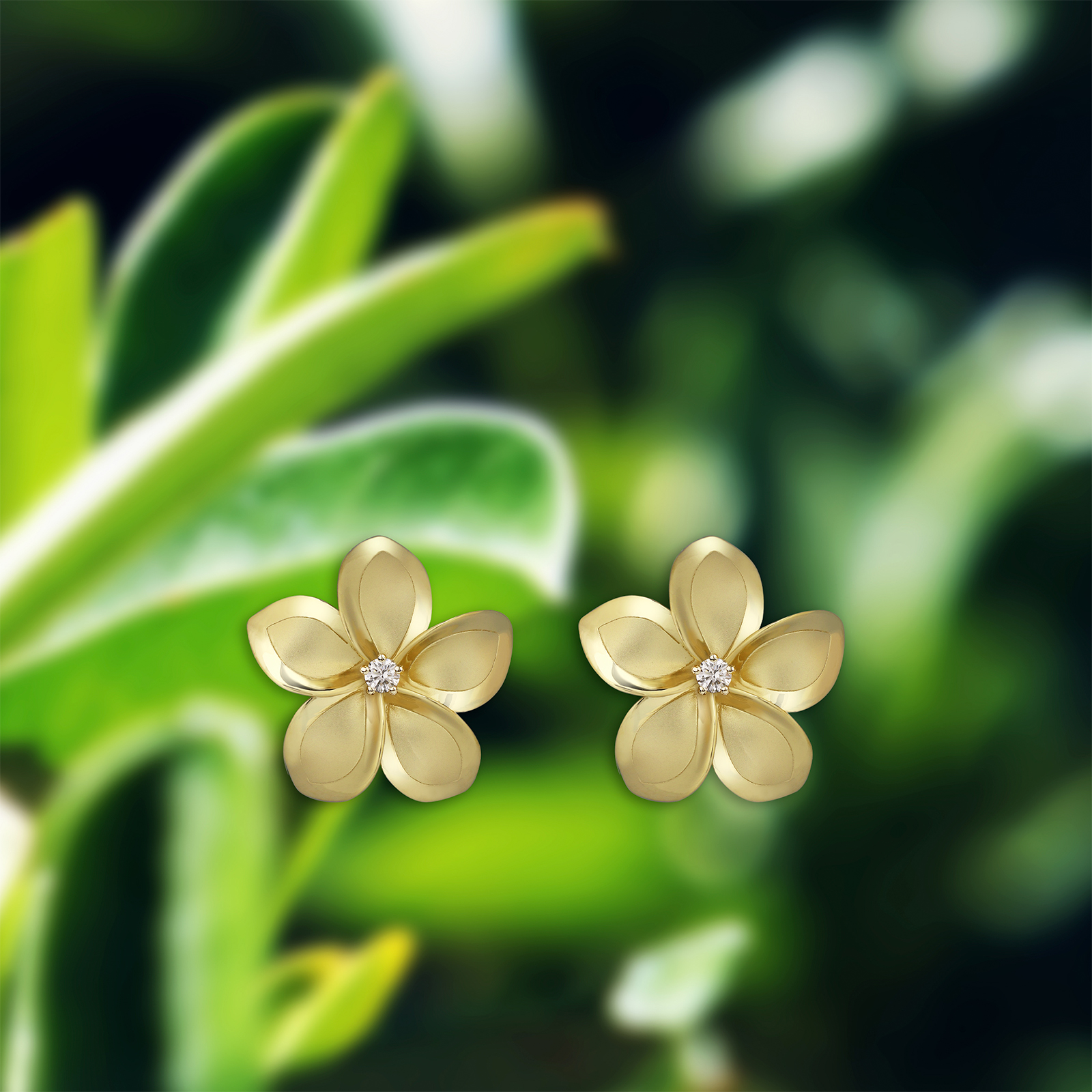 A beautiful, 14K gold Queen Plumeria stud earring set with diamond center. Available in 8mm (approx. 3/8″), 10mm (7/16″), 12mm (approx. 1/2″), or 14mm (approx. 5/8″) flower sizes, with a .04ct t/w or .06ct t/w diamond center. Plumeria flowers primarily symbolize natural beauty, charm, and grace. Secondly, they represent spring, new life, new beginning, or birth. The plumeria flower has a special significance in the Hawaiian culture as it symbolizes everything that is positive. It is also used for making leis.