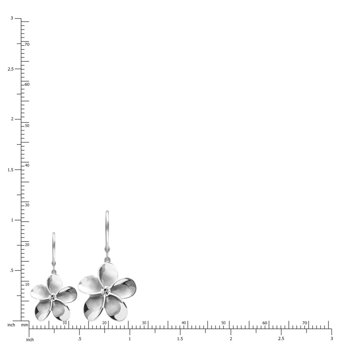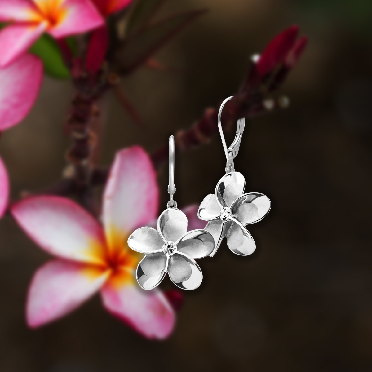 Gorgeous, Queen Plumeria sterling silver leverback earrings with CZ stones. Available flower sizes are 12mm (approx. 1/2″) or 15mm (approx. 5/8″) with cubic zirconia center stones.