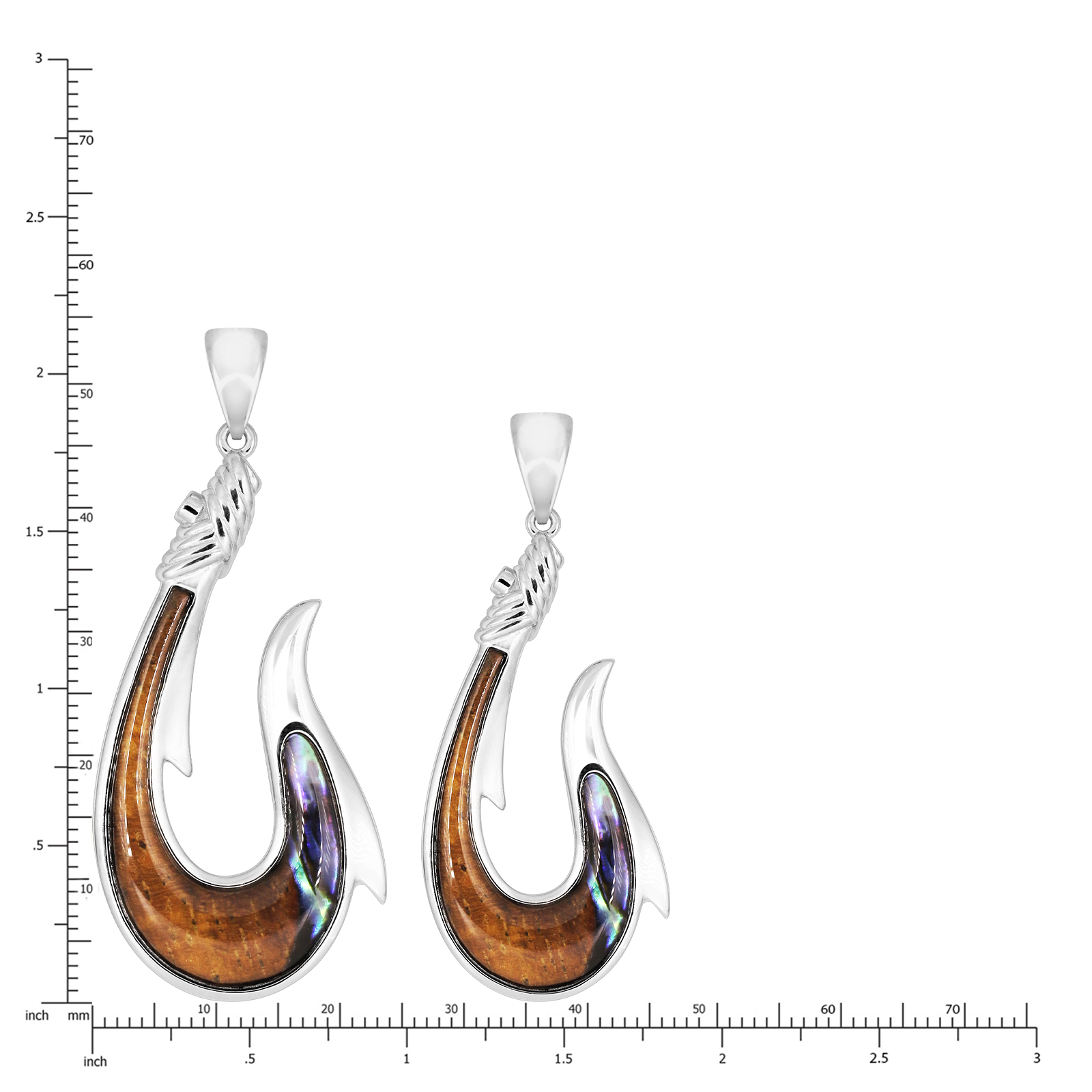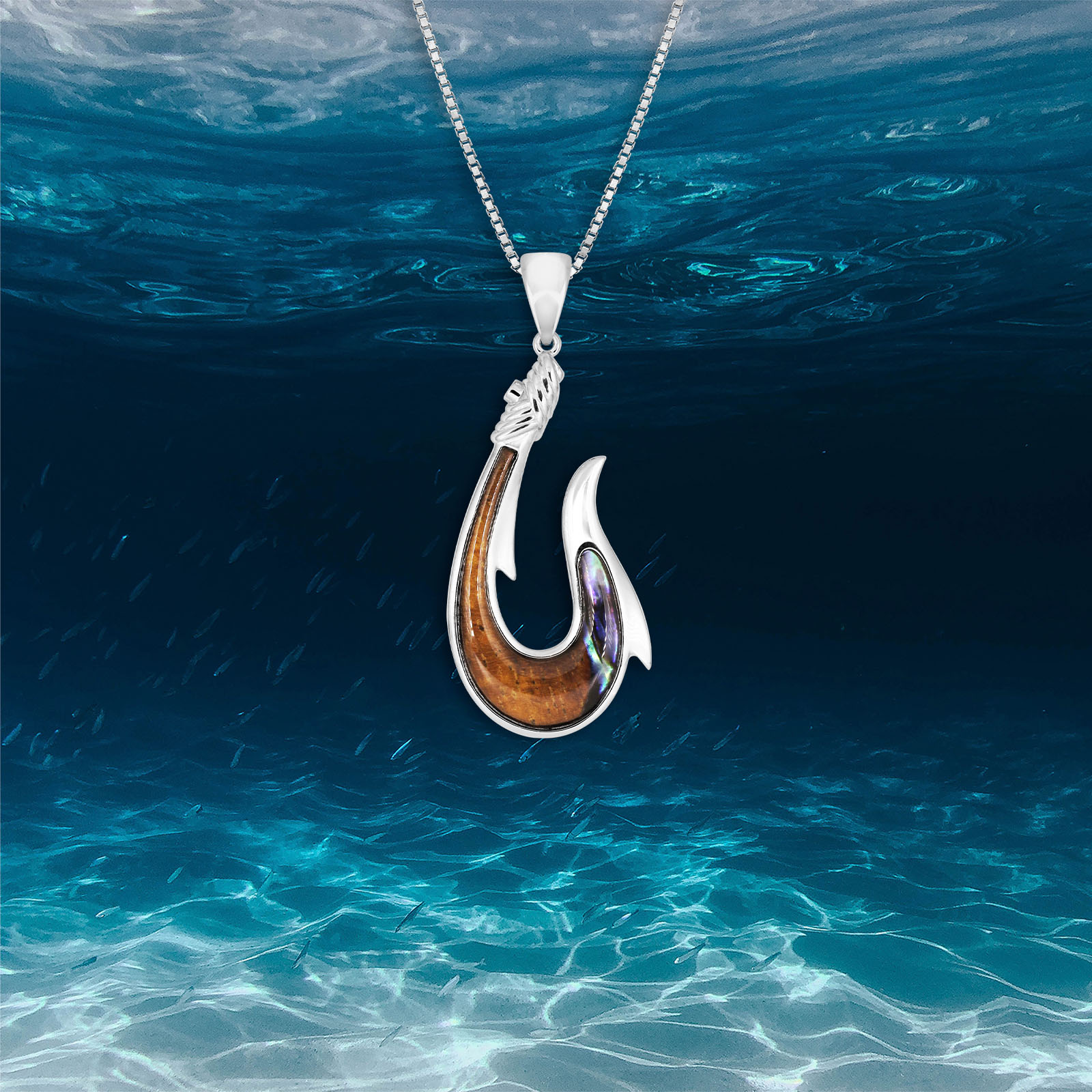 Rope Hook Pendant with Koa Inlay and Abalone 40mm tall and 19mm across. Choice of 18″ box chain or black cord included. Lifetime guarantee. From Honolulu, Hawaii.