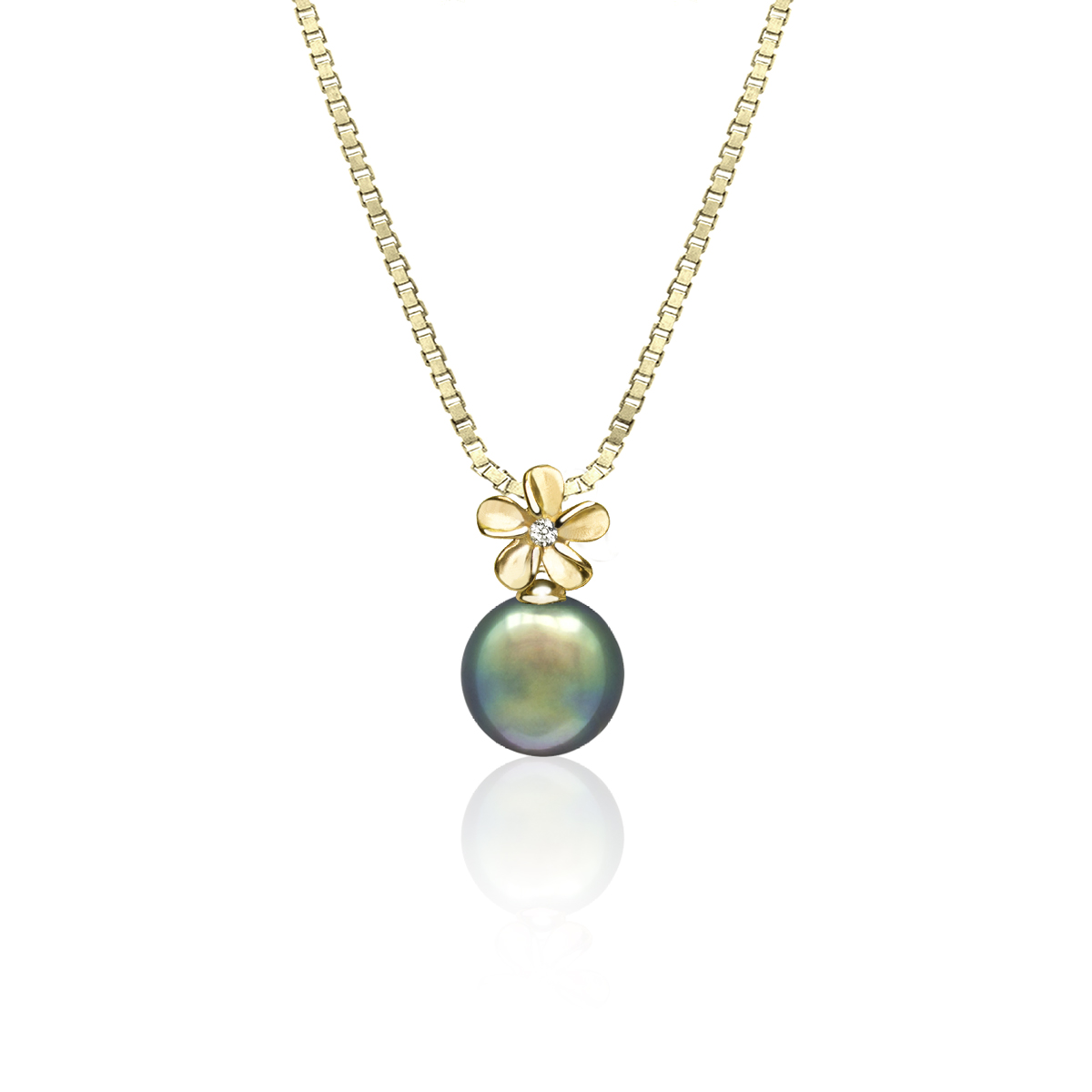 Stunning, 14K gold Tahitian Peacock Pearl Diamond Pendant. 10mm (approx. 3/8″) pearl with .03ct diamond. Perfect for everyday wear. Lifetime guarantee. From Honolulu, Hawaii.