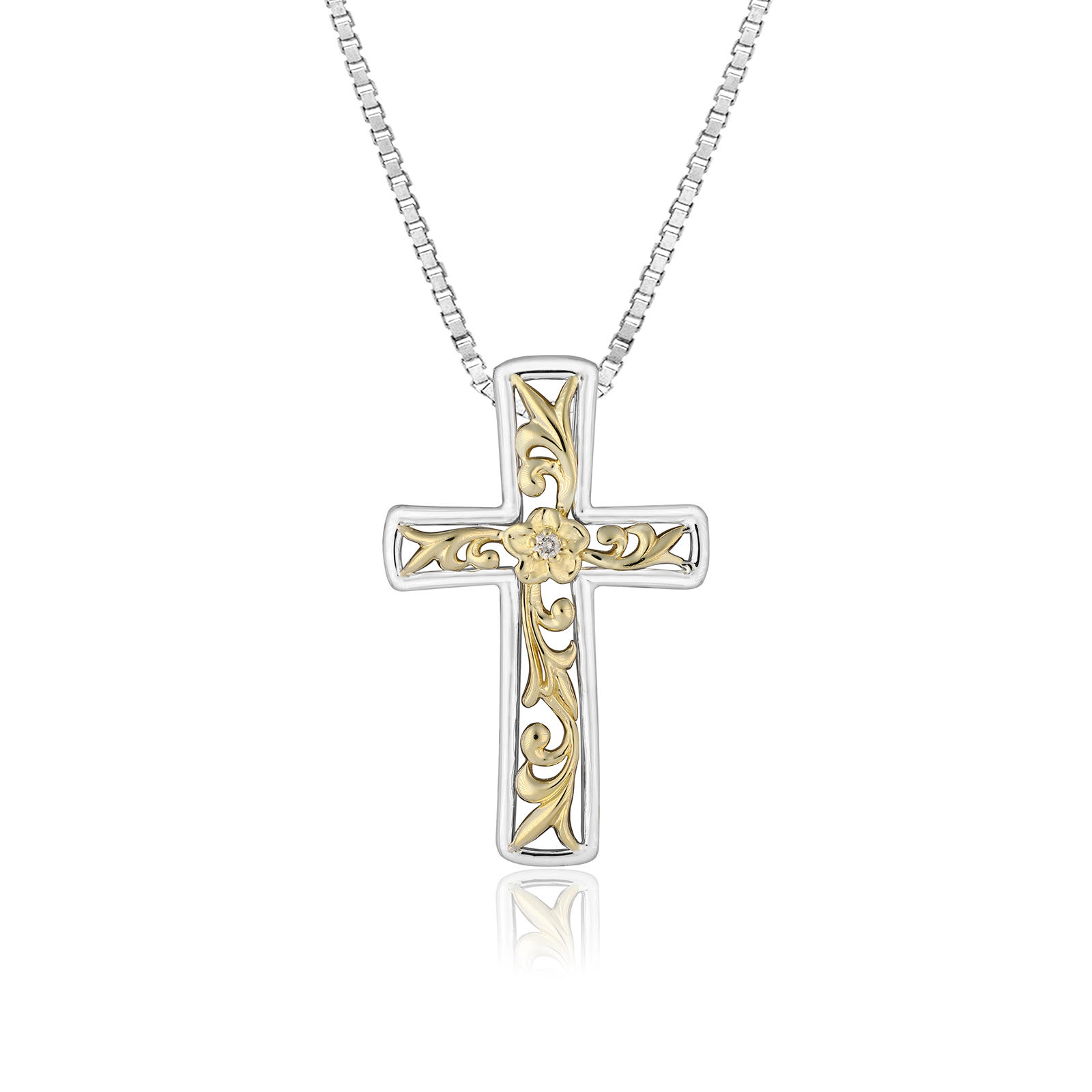 Two Tone Plumeria Scroll Cross Pendant with Diamond Center
